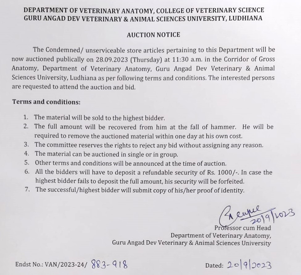Auction notice for the Un-serviceable items, Professor-cum-Head, Dept.of Veterinary Anatomy, COVS, Guru Angad Dev Veterinary and Animal Sciences University, Ludhiana
