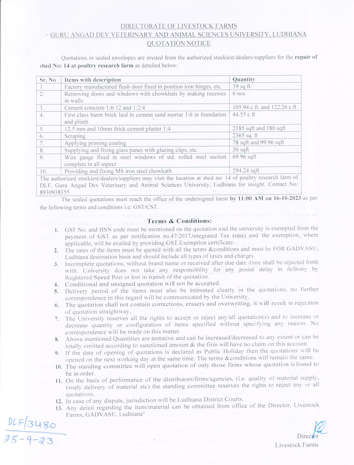 Quotation notice for the Repair of Shed No. 14 Poultry Research Farm, Directorate of Livestock Farms, Guru Angad Dev Veterinary and Animal Sciences University, Ludhiana