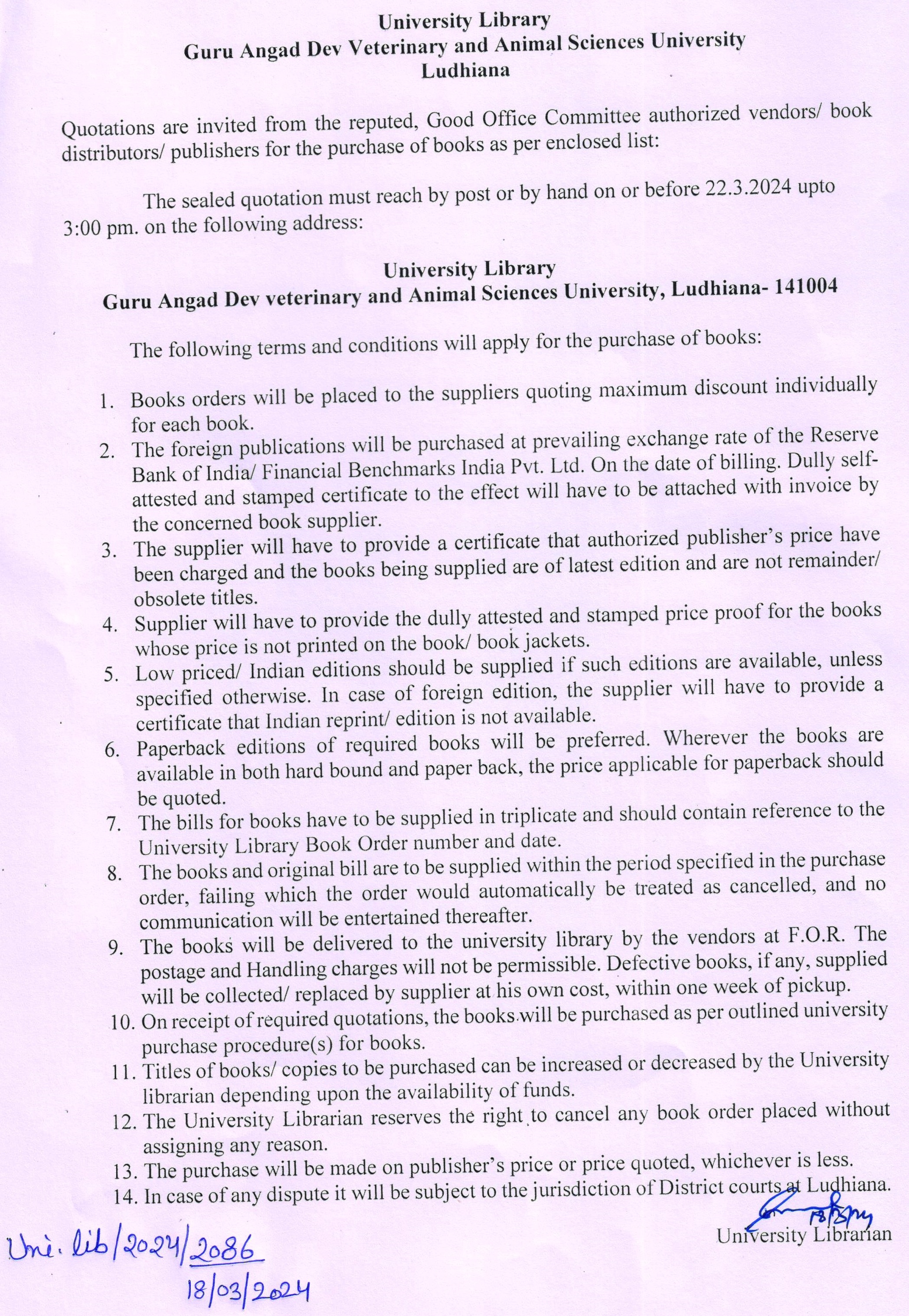 Quotation notice for the purchase of Books, University Library, Guru Angad Dev Veterinary & Animal Sciences University, Ludhiana