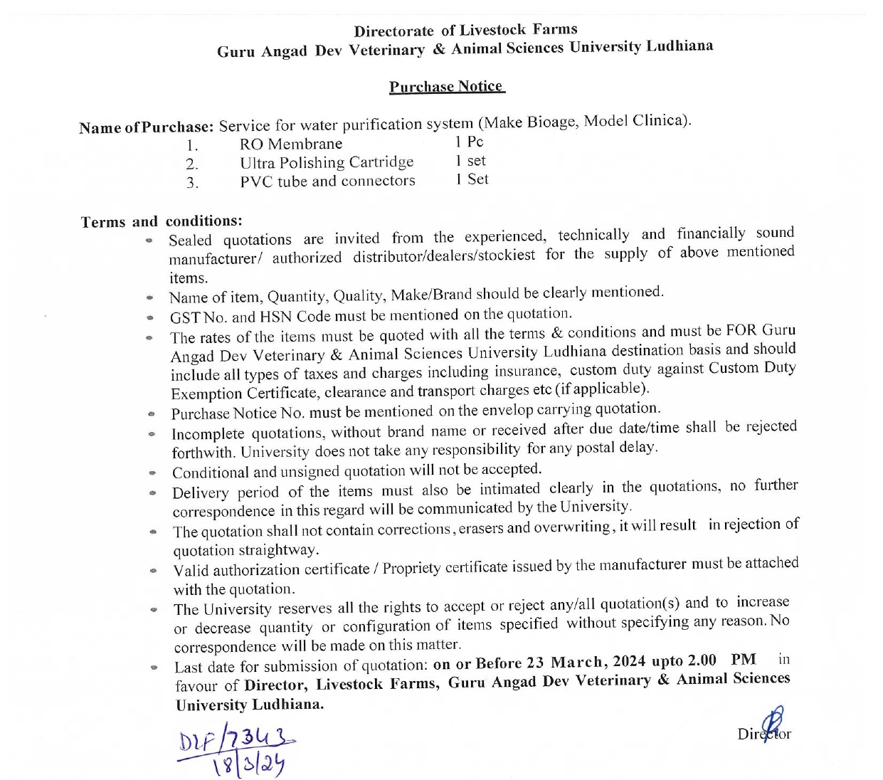 Quotation Notice for the purchase of Service for Water Purification System, Director, Livestock Farms, Guru Angad Dev Veterinary & Animal Sciences University, Ludhiana