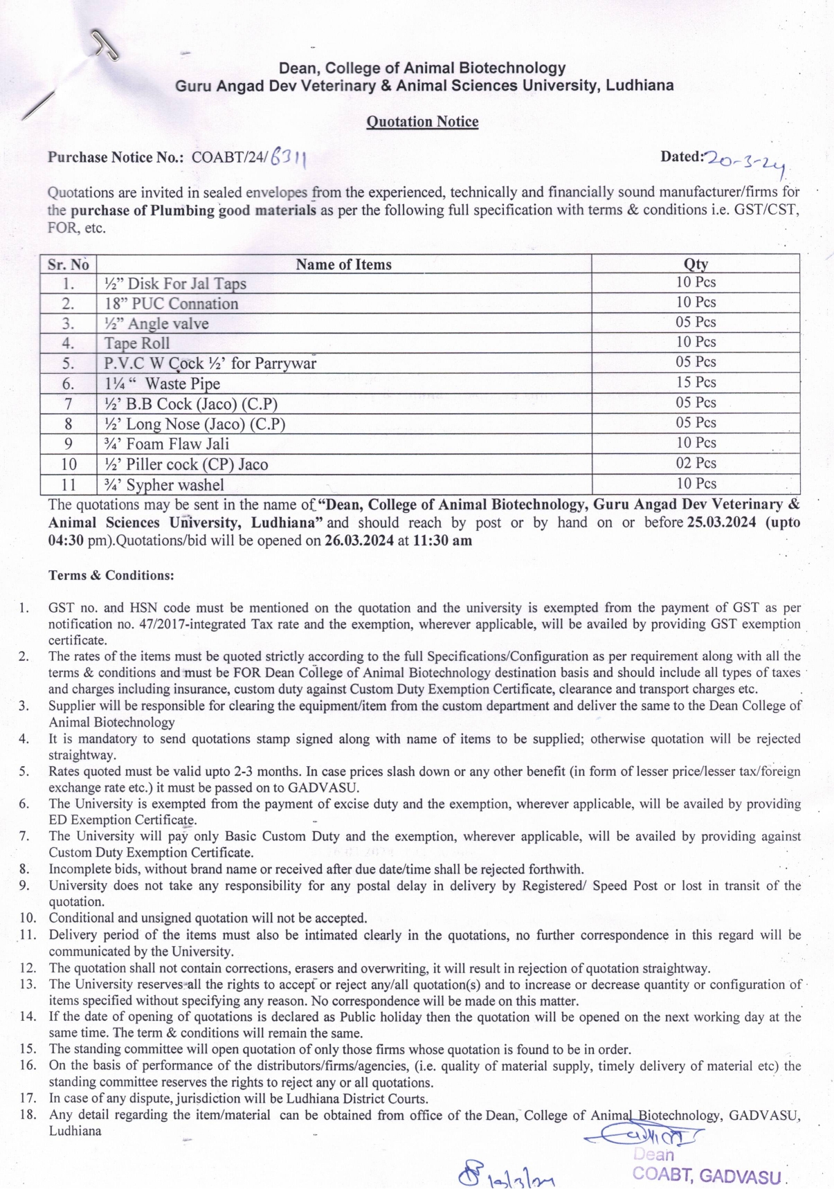 Quotation Notice for the purchase of Plumbing Good Materials, Dean, College of Animal Biotechnology, Guru Angad Dev Veterinary & Animal Sciences University, Ludhiana