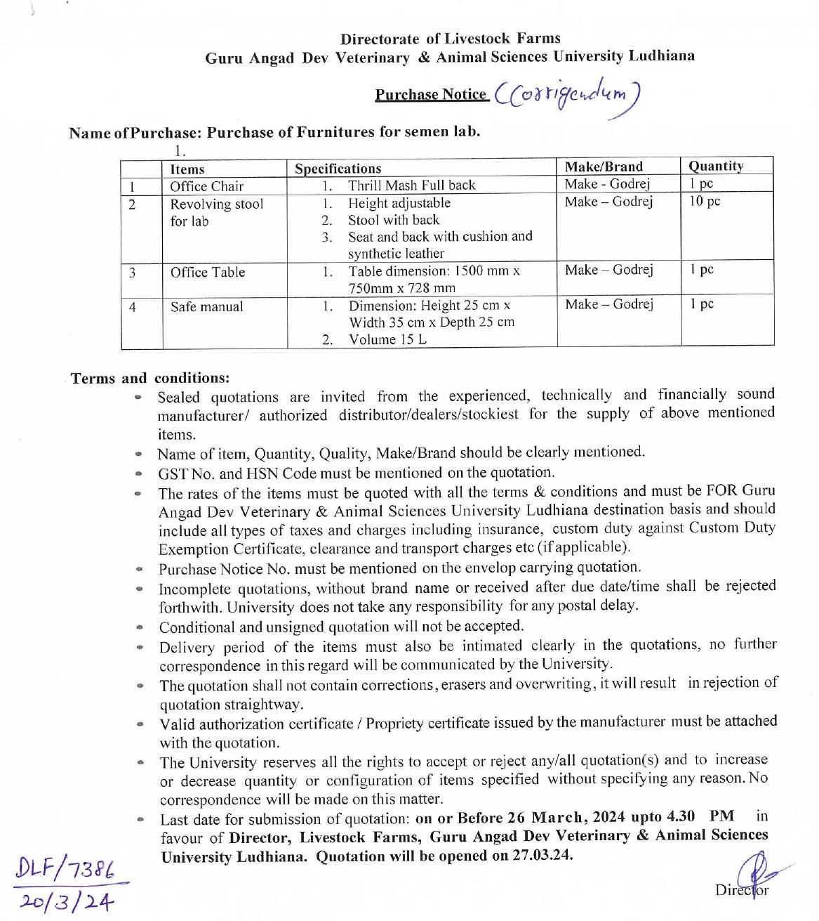 Corrigendum Quotation Notice for the purchase of Furnitures for semen lab, Director, Directorate of Livestock Farms, Guru Angad Dev Veterinary & Animal Sciences University, Ludhiana