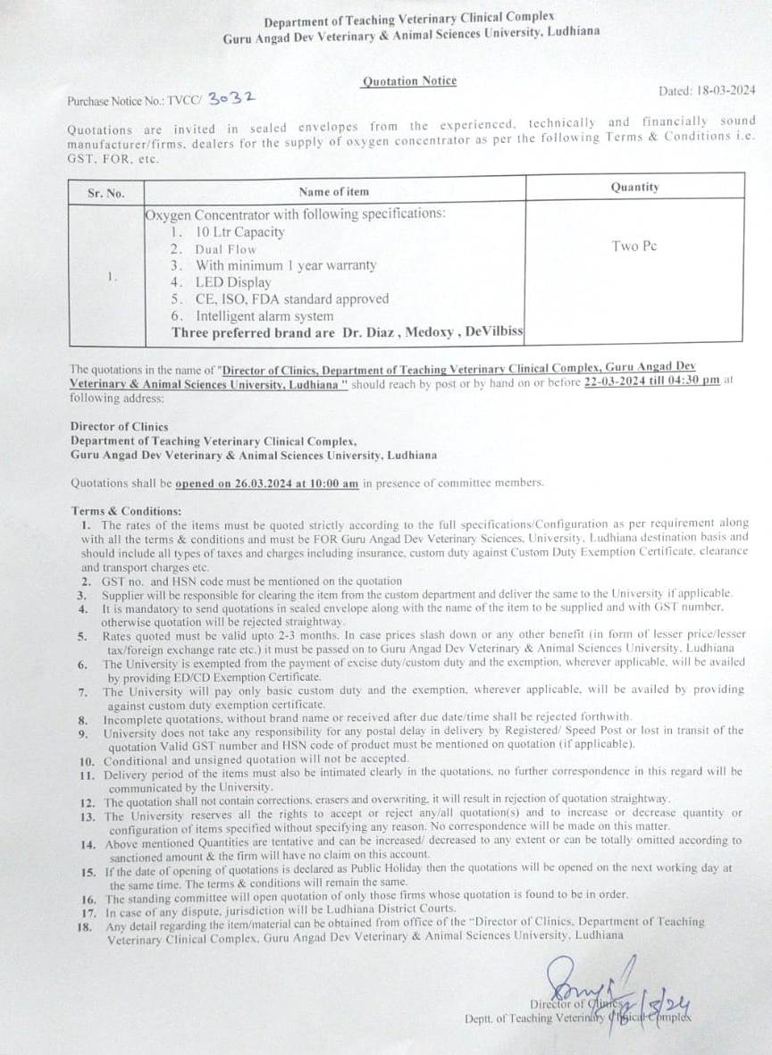 Quotation Notice for the supply of Oxygen Concentrator, Director of Clinics, Department of Teaching Veterinary Clinical Complex, GADVASU, Ludhiana