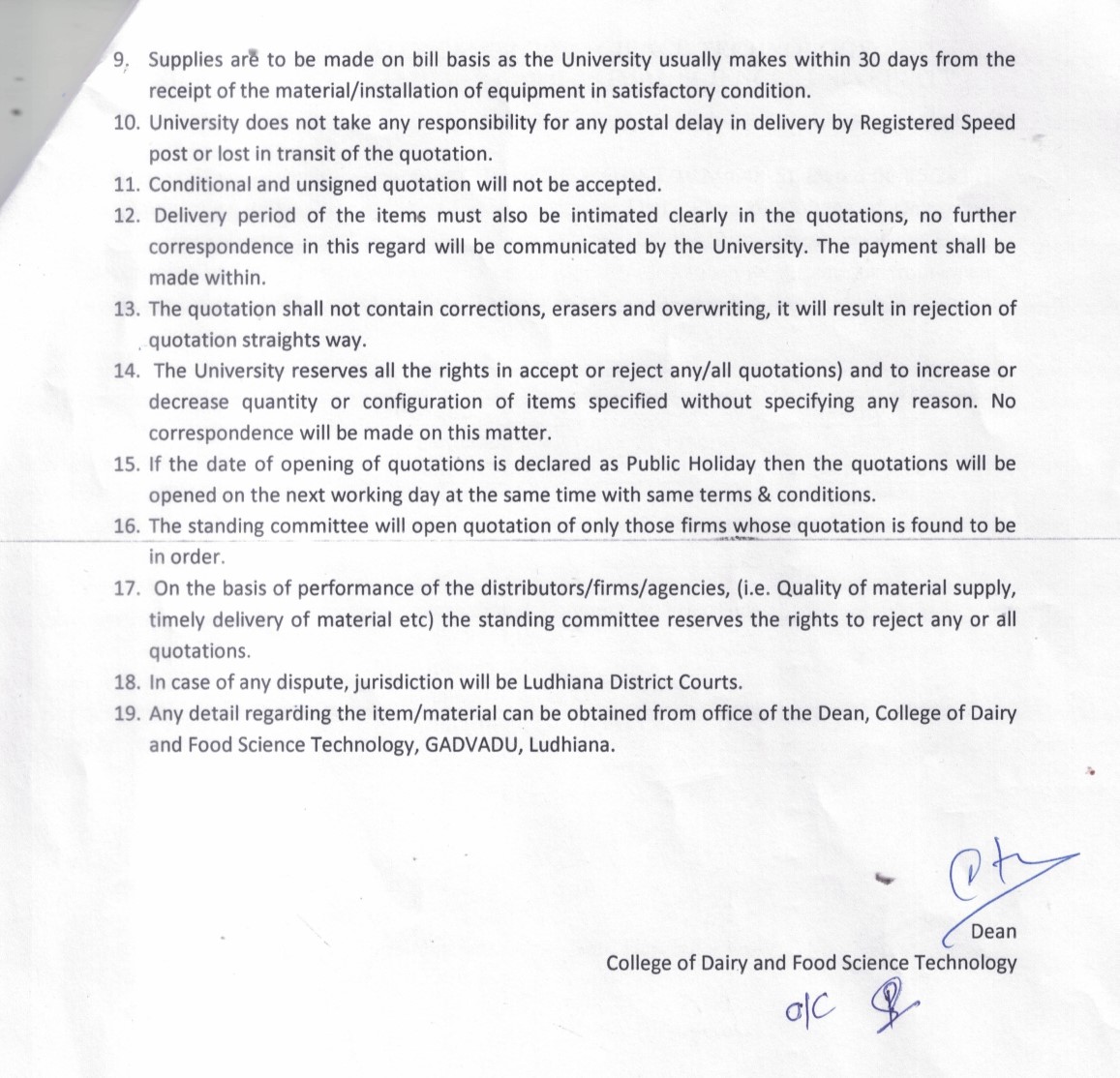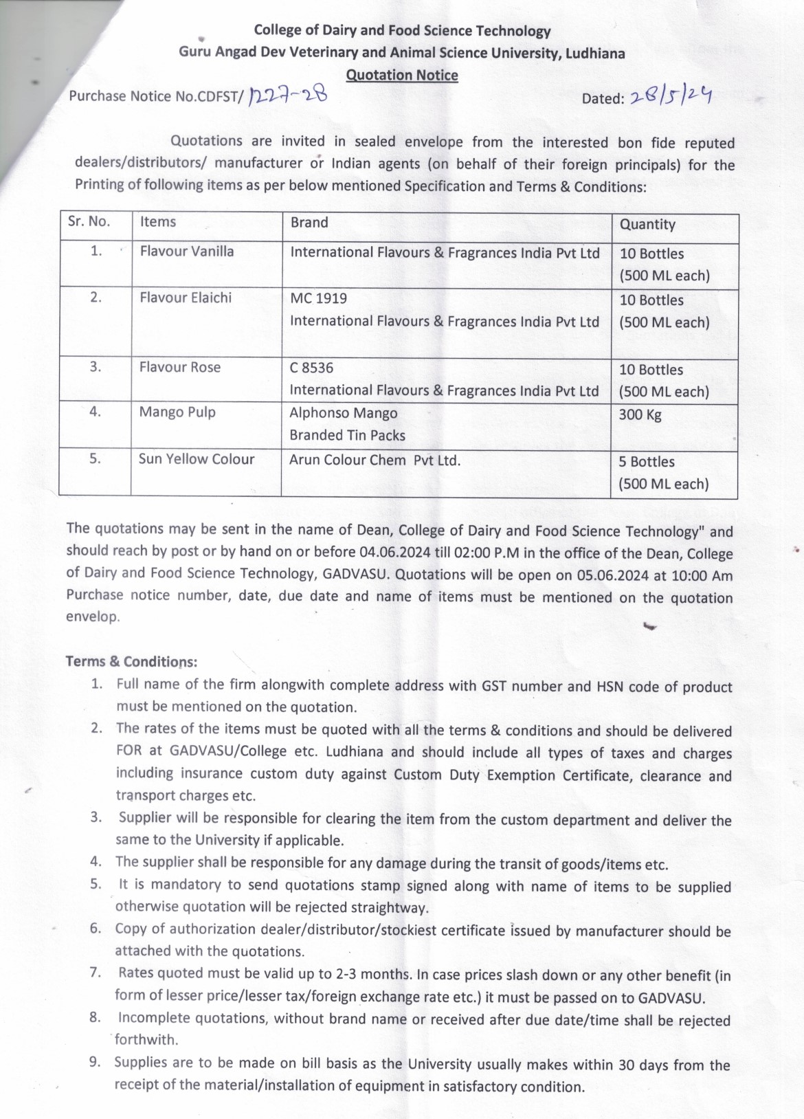 Quotation Notice for the printing of various items, College of Dairy and Food Science Technology, Guru Angad Dev Veterinary & Animal Sciences University, Ludhiana