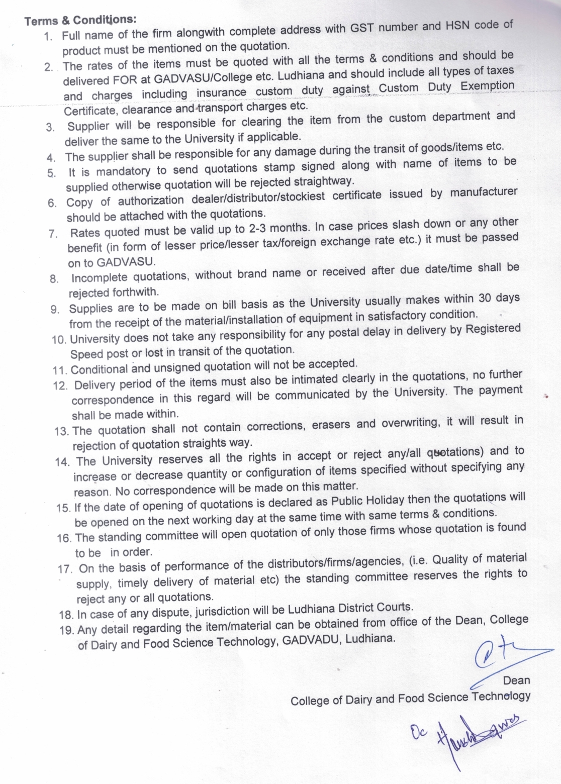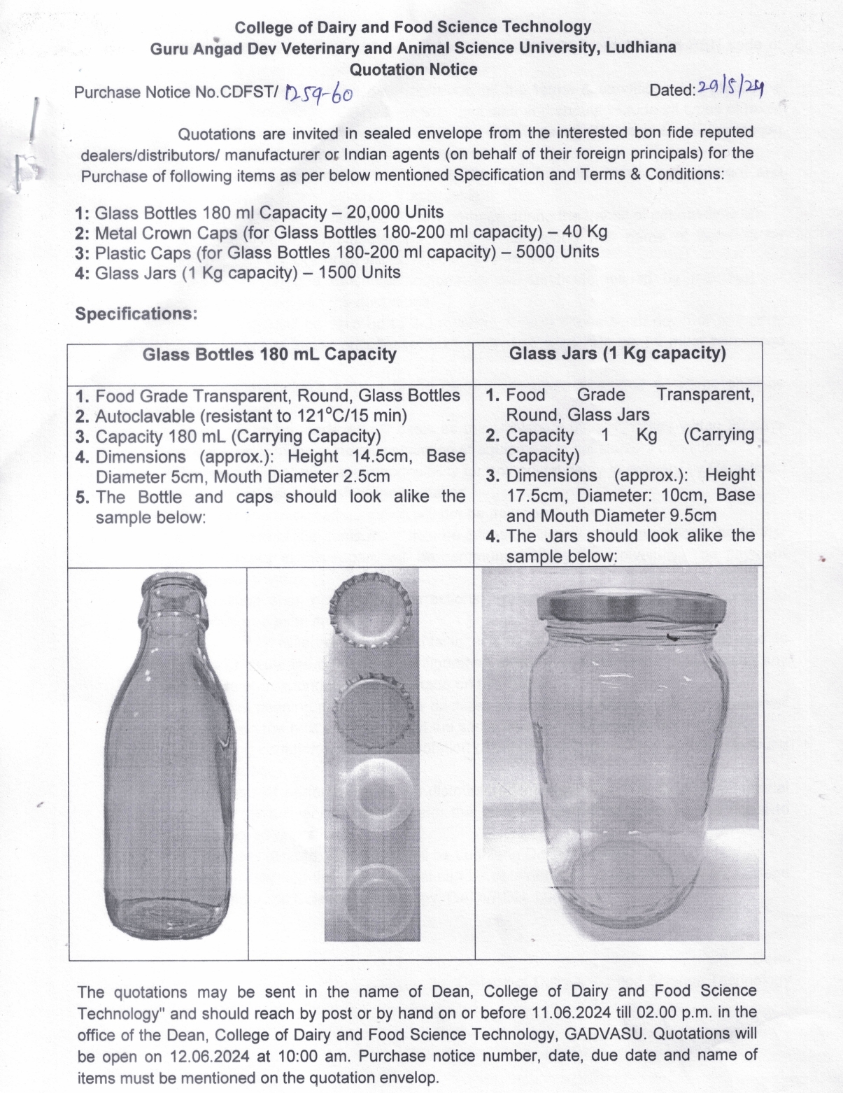 Quotation Notice for the supply of Glass Bottles, Metal Crown Caps, Plastic Caps, Glass Jars, Dean, College of Dairy and Food Science Technology, Guru Angad Dev Veterinary & Animal Sciences University