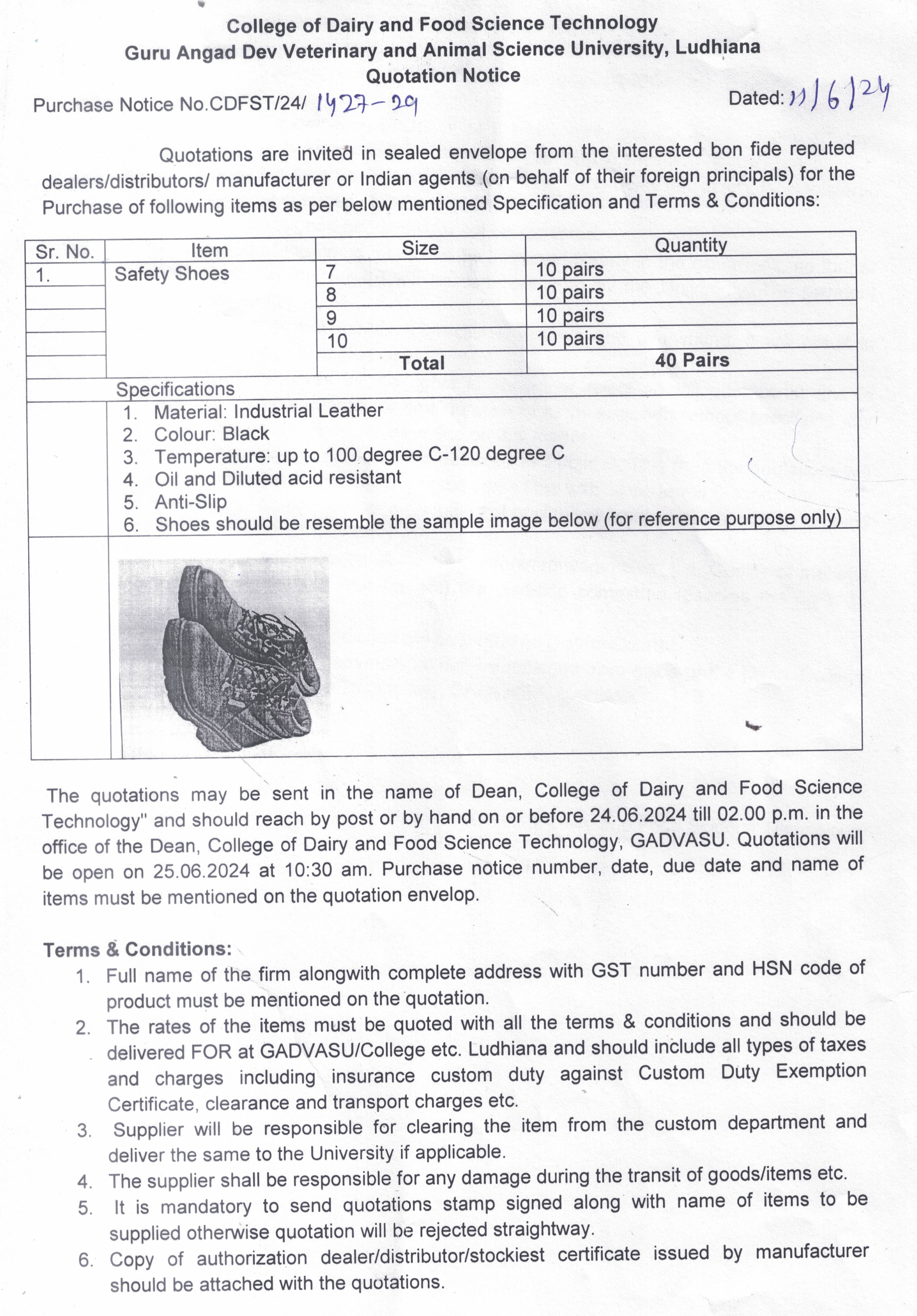 Quotation Notice for the purchase of Safety Shoes, Dean, College of Dairy and Food Science Technology, Guru Angad Dev Veterinary & Animal Sciences University, Ludhiana