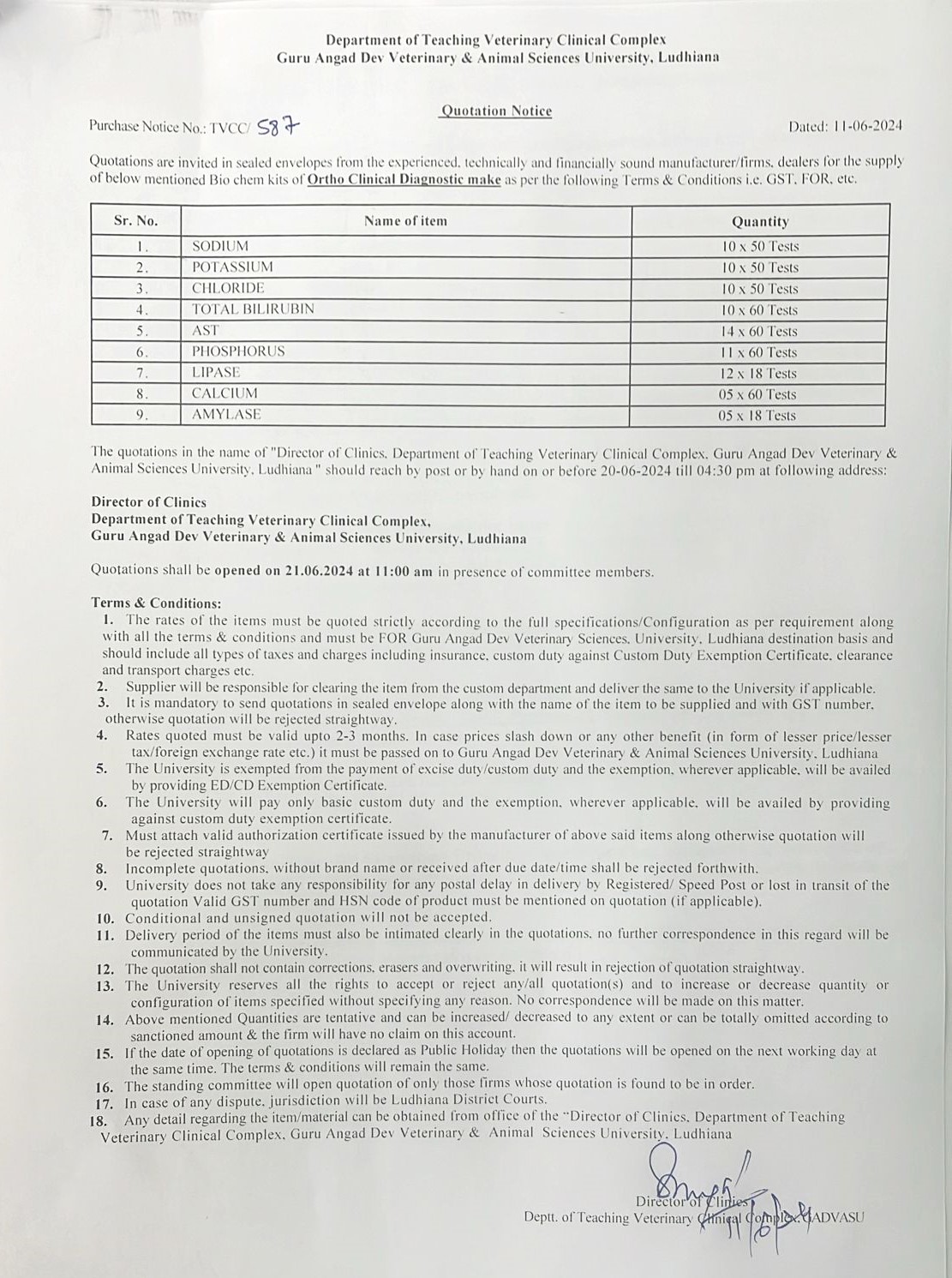 Quotation Notice for the supply of Bio Chem Kits of Ortho Clinical Diagnostic Make, Director of Clinics, Department of Teaching Veterinary Clinical Complex, GADVASU, Ludhiana
