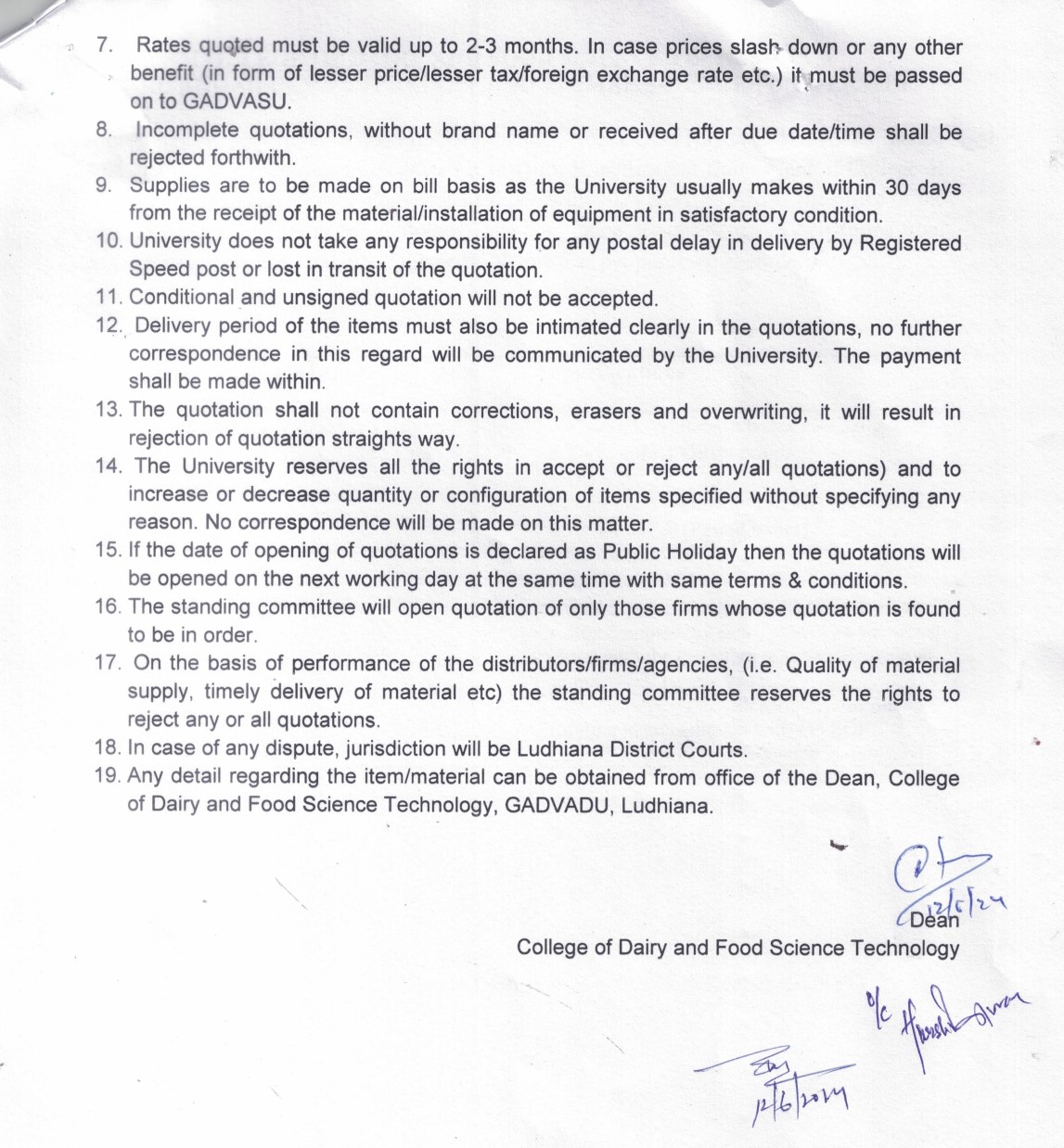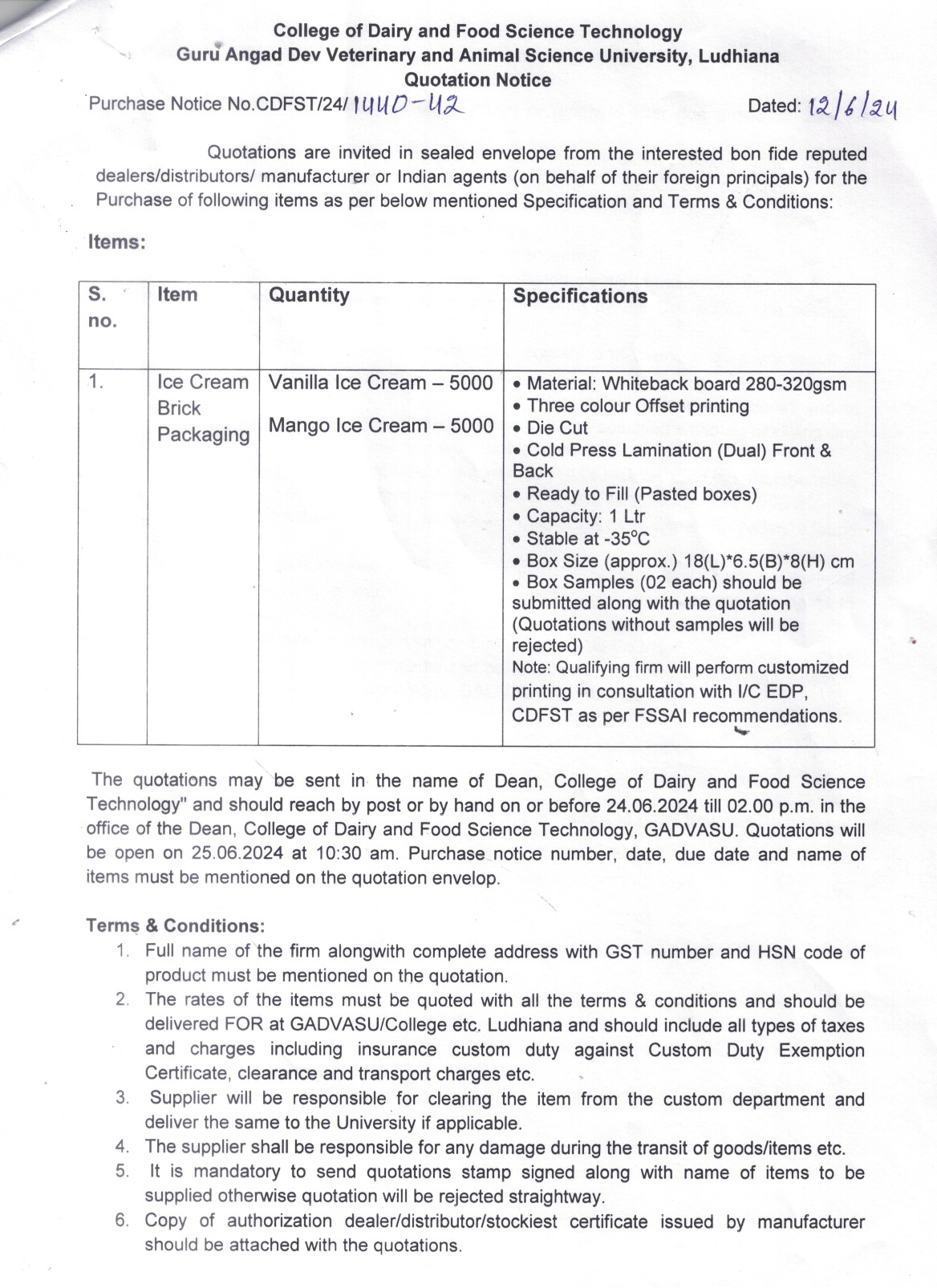Quotation Notice for the purchase of Ice Cream Brick Packaging, Dean, College of Dairy and Food Science Technology, Guru Angad Dev Veterinary & Animal Sciences University, Ludhiana