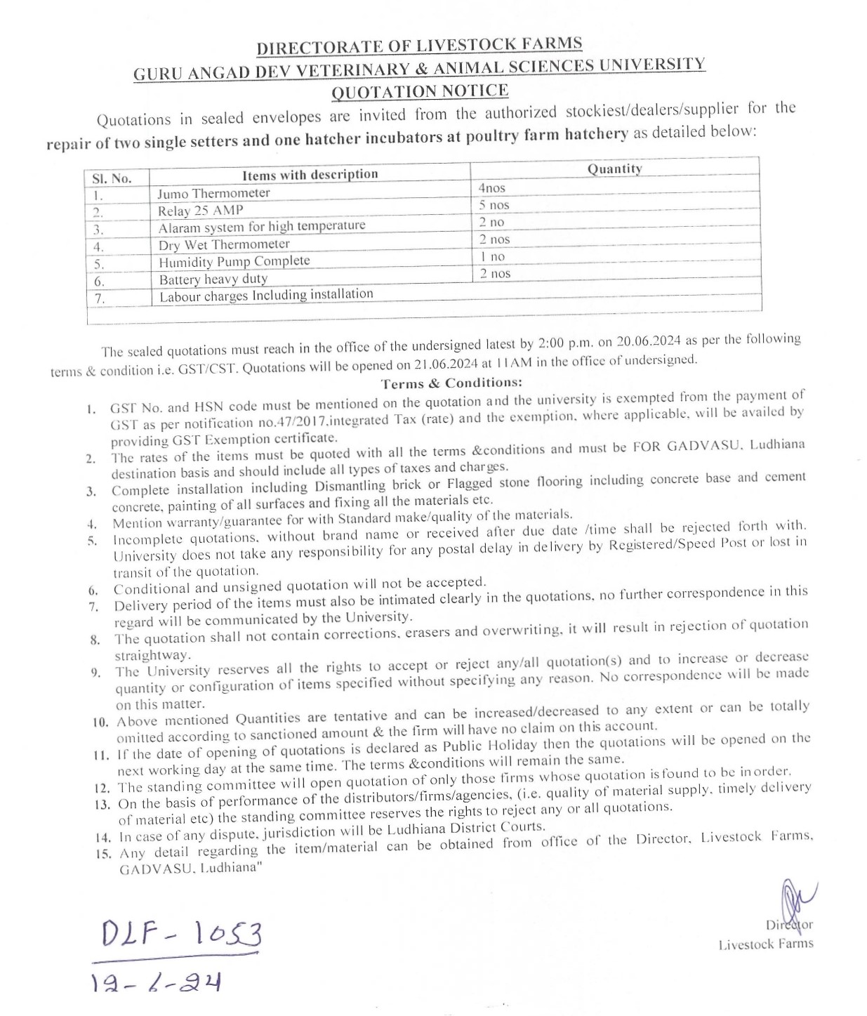 Quotation Notice for the repair of two single setters and one hatcher incubators at poultry farm hatchery, Director, Directorate of Livestock Farms, GADVASU, Ludhiana