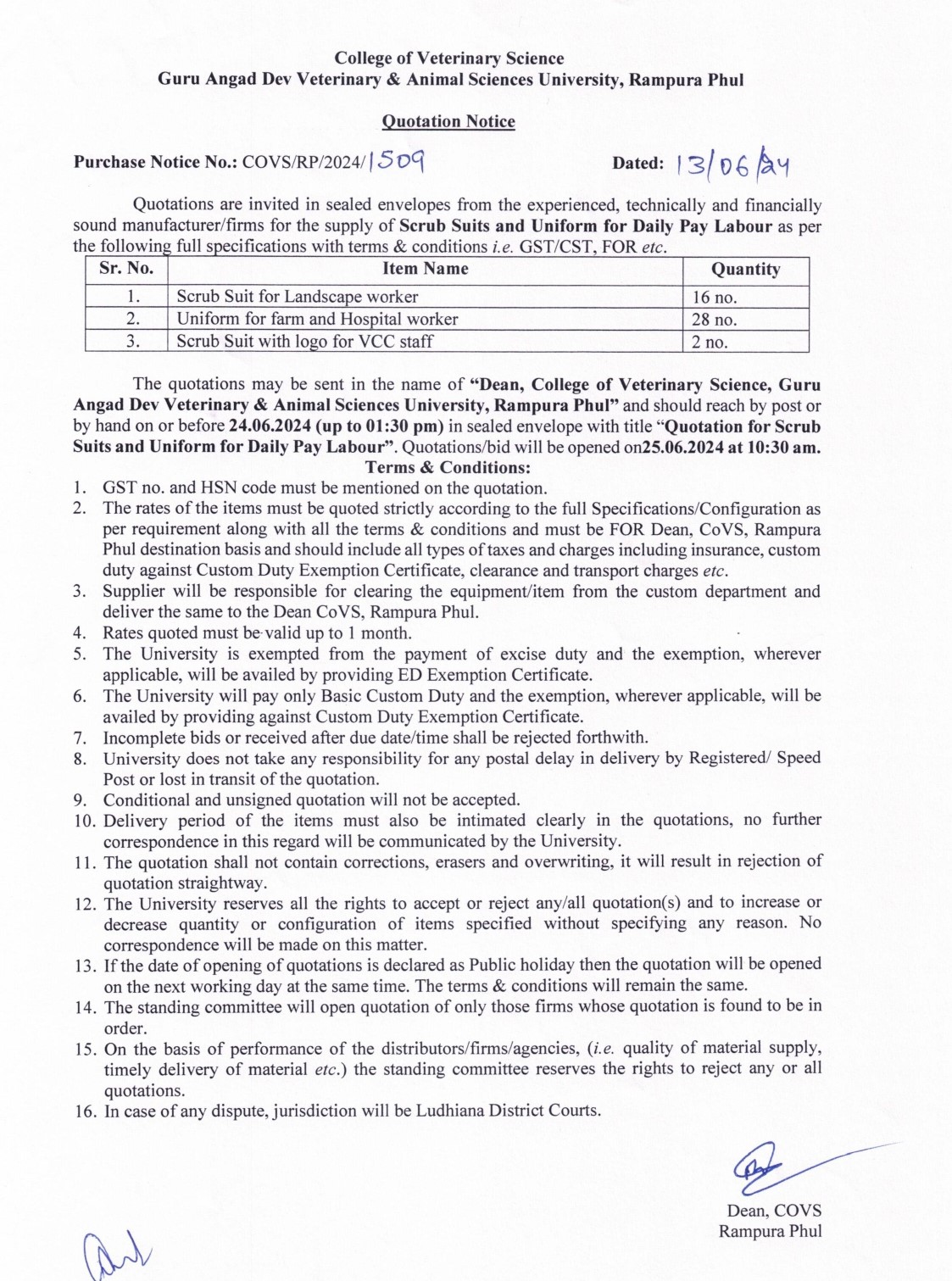 Quotation notice for the supply of Scrub Suits and Uniform for Daily Pay Labour, Dean, College of Veterinary Science, Guru Angad Dev Veterinary & Animal Sciences University, Rampura Phul