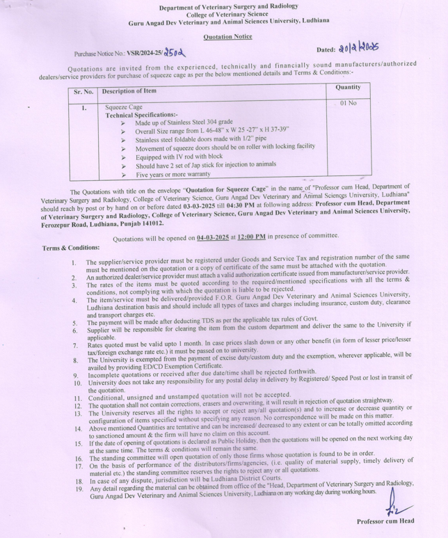 Quotation Notice for the purchase of squeeze cage, Department of Veterinary Surgery and Radiology, COVS, Guru Angad Dev Veterinary & Animal Sciences University, Ludhiana