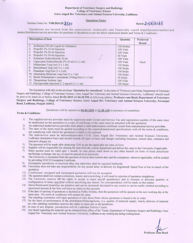 Quotation Notice for the purchase of Anesthesia, Department of Veterinary Surgery and Radiology, COVS, Guru Angad Dev Veterinary & Animal Sciences University, Ludhiana