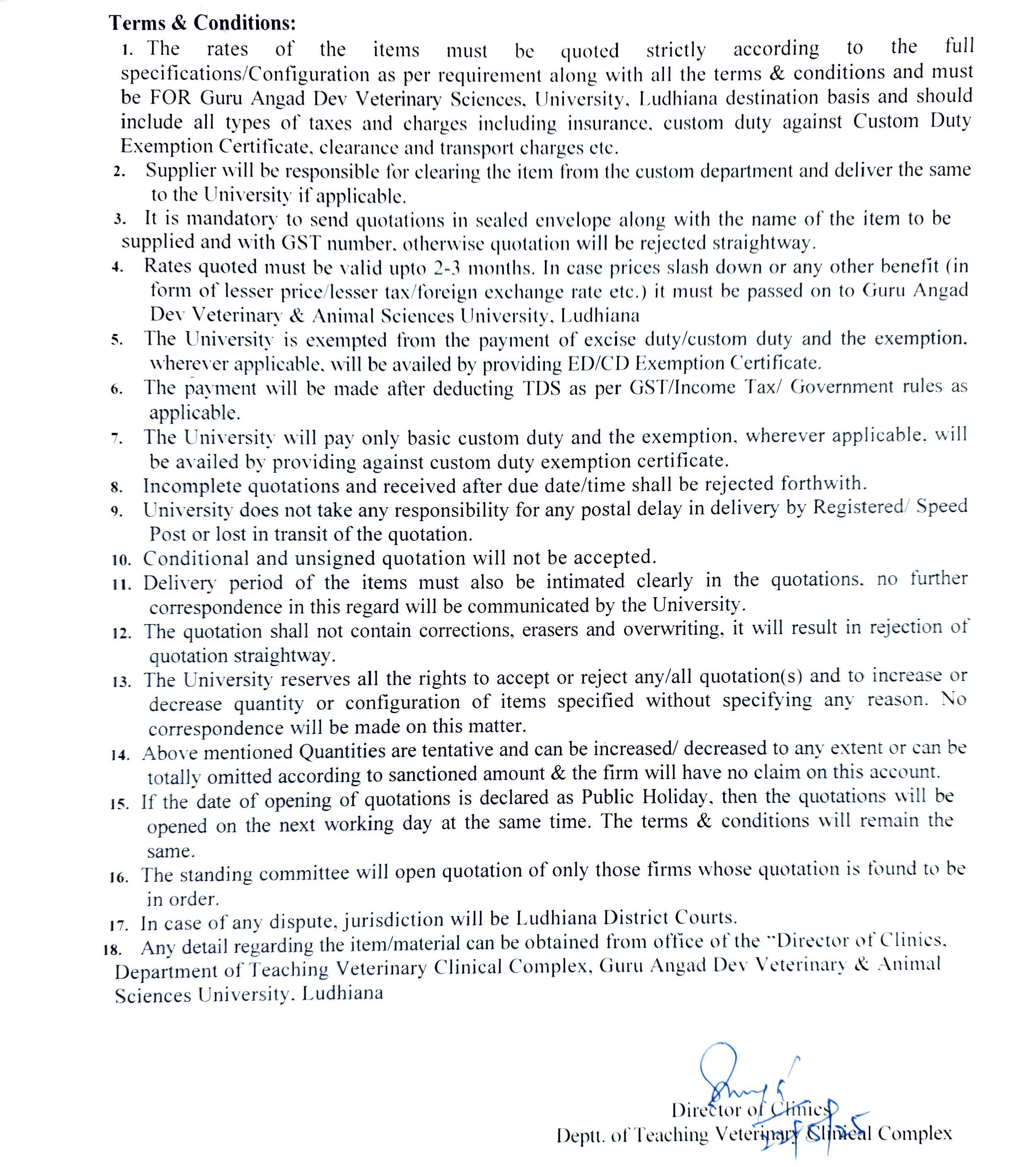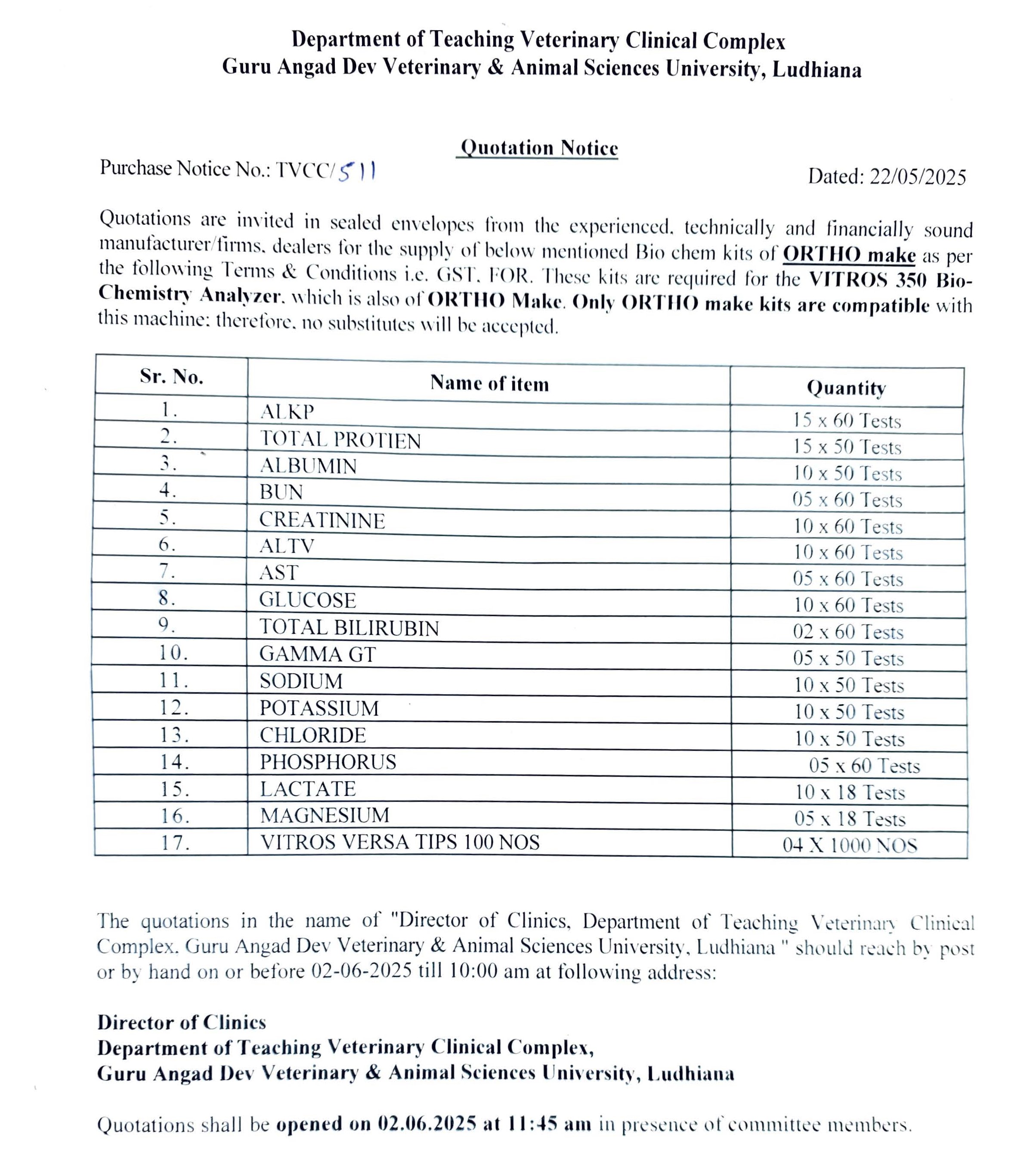 Quotation Notice for the supply of Bio chem kits of ORTHO make, Director of Clinics, Department of Teaching Veterinary Clinical Complex, Guru Angad Dev Veterinary & Animal Sciences University, Ldh