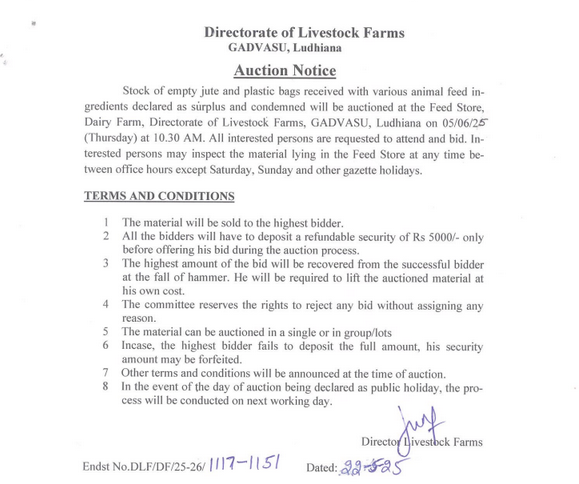 Auction Notice for Stock of Empty Jute and Plastic Bags received with various animal feed ingredients at Feed Store, Dairy Farm, Directorate of Livestock Farms, GADVASU, Ludhiana