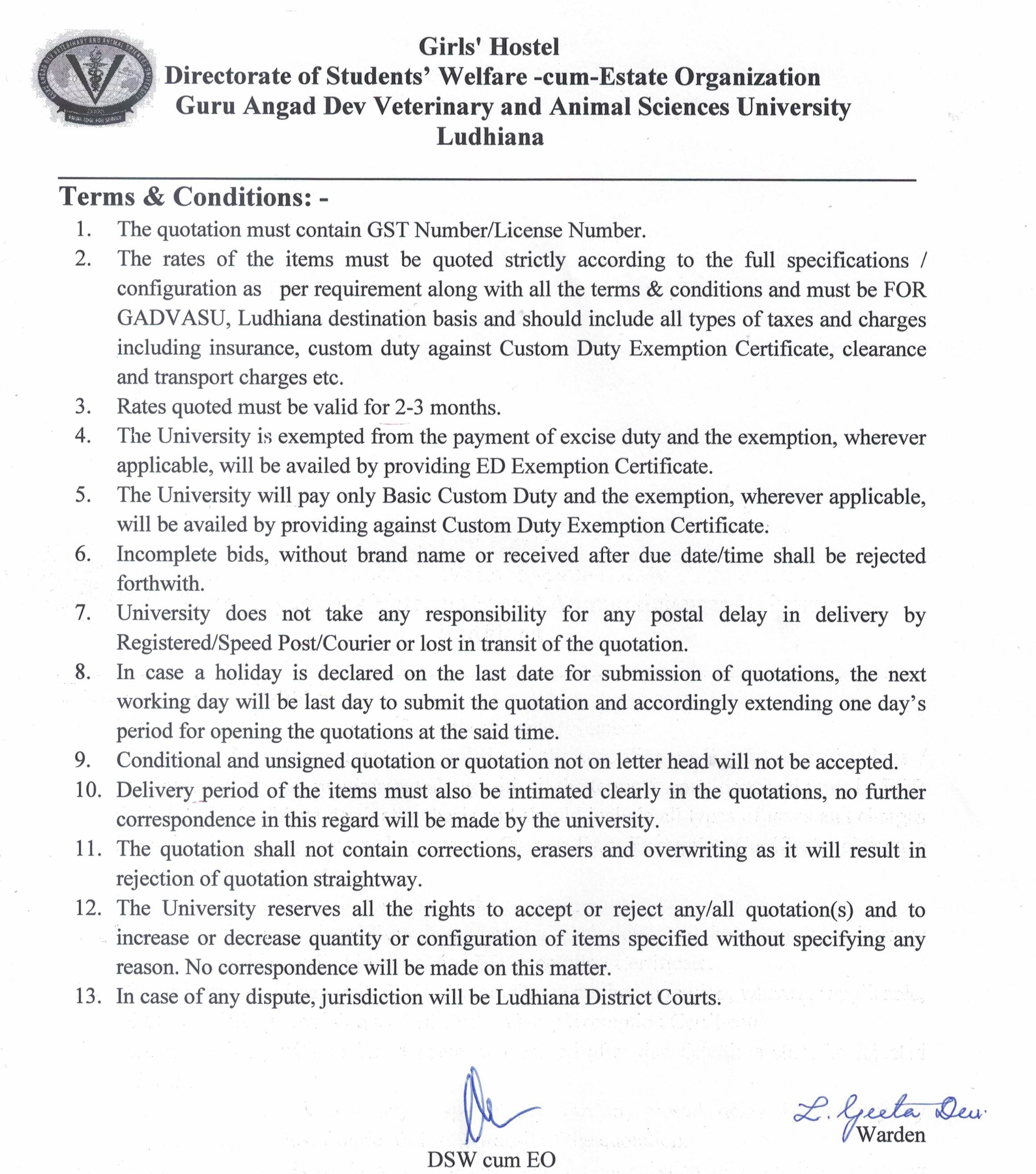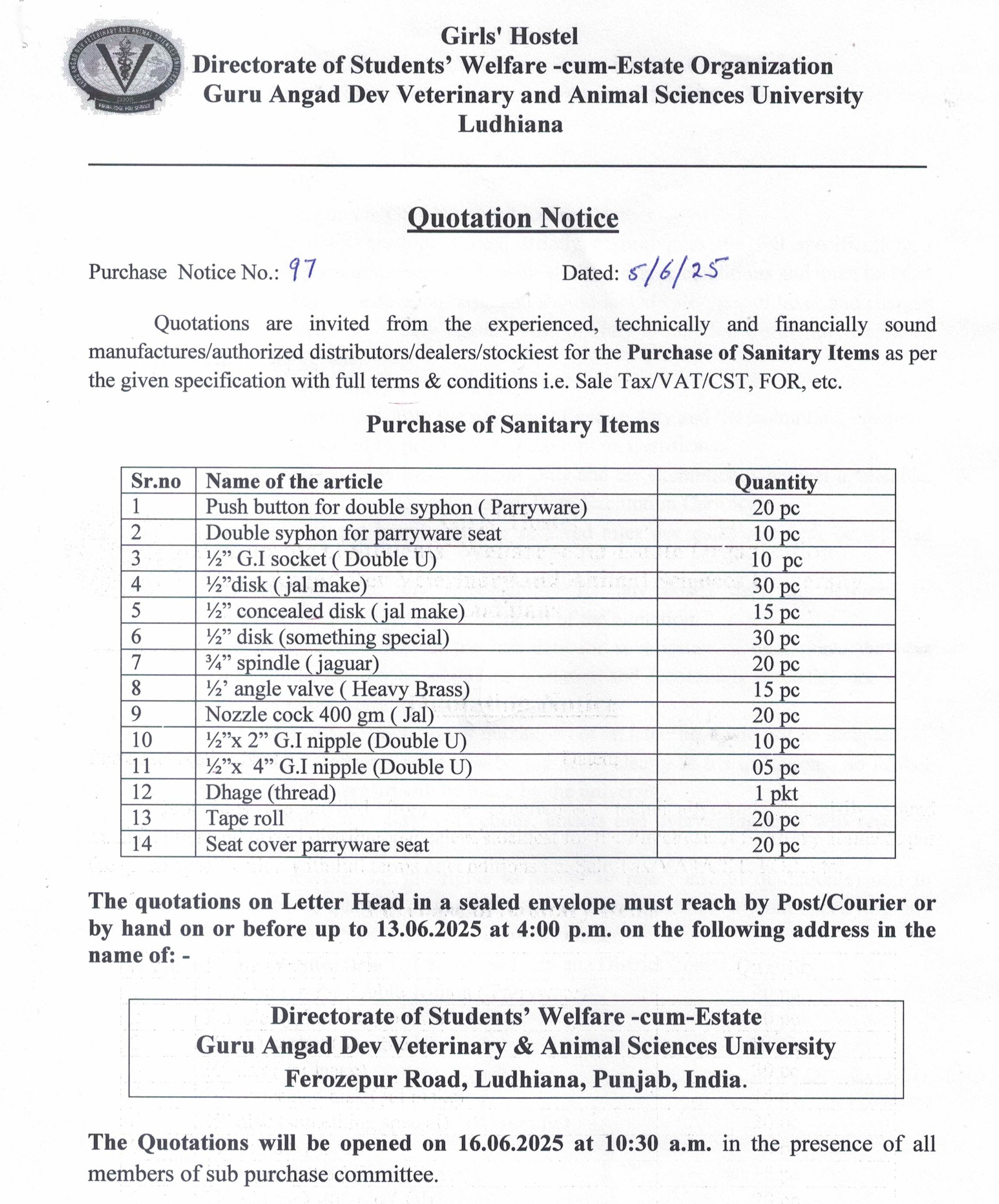 Quotation notice for the purchase of Sanitary items, Director Students Welfare-cum-Estate Organization, Guru Angad Dev Veterinary & Animal Sciences University, Ludhiana