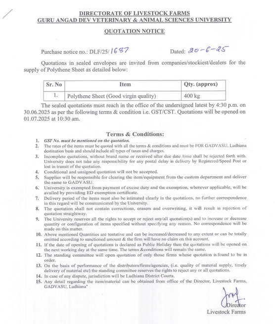 Quotation Notice for the supply of Polythene Sheet, Director, Livestock Farms, Guru Angad Dev Veterinary & Animal Sciences University, Ludhiana