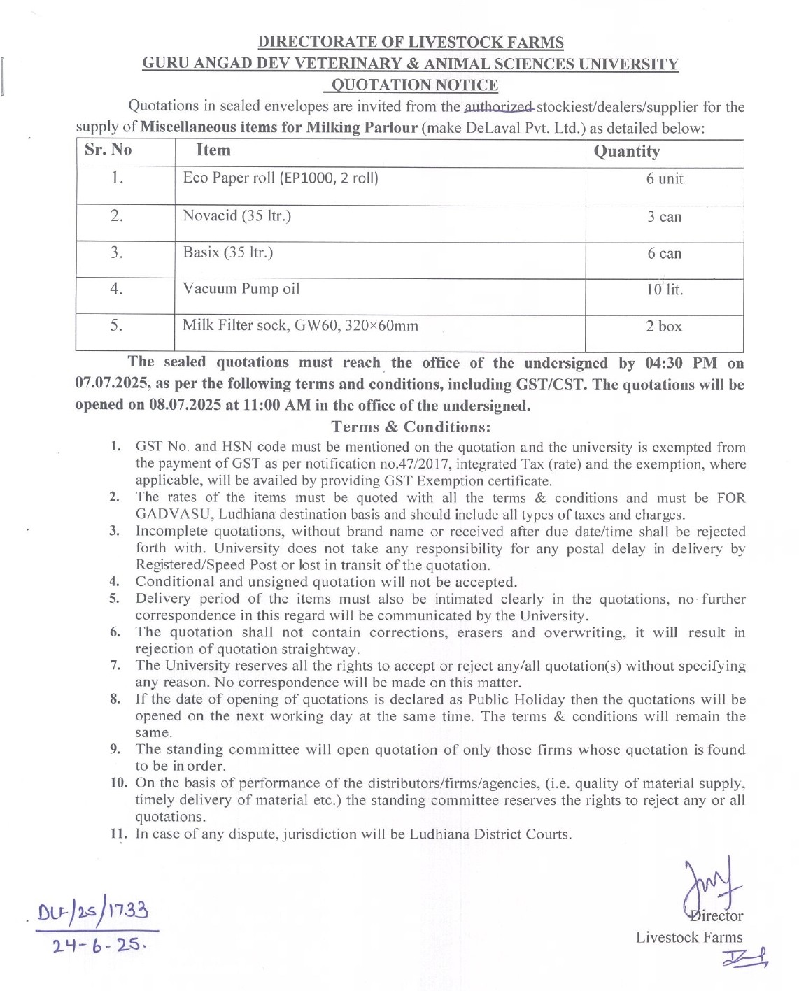 Quotation Notice for the supply of Miscellaneous items for Milking Parlour, Directorate of Livestock Farms, Guru Angad Dev Veterinary & Animal Sciences University, Ludhiana