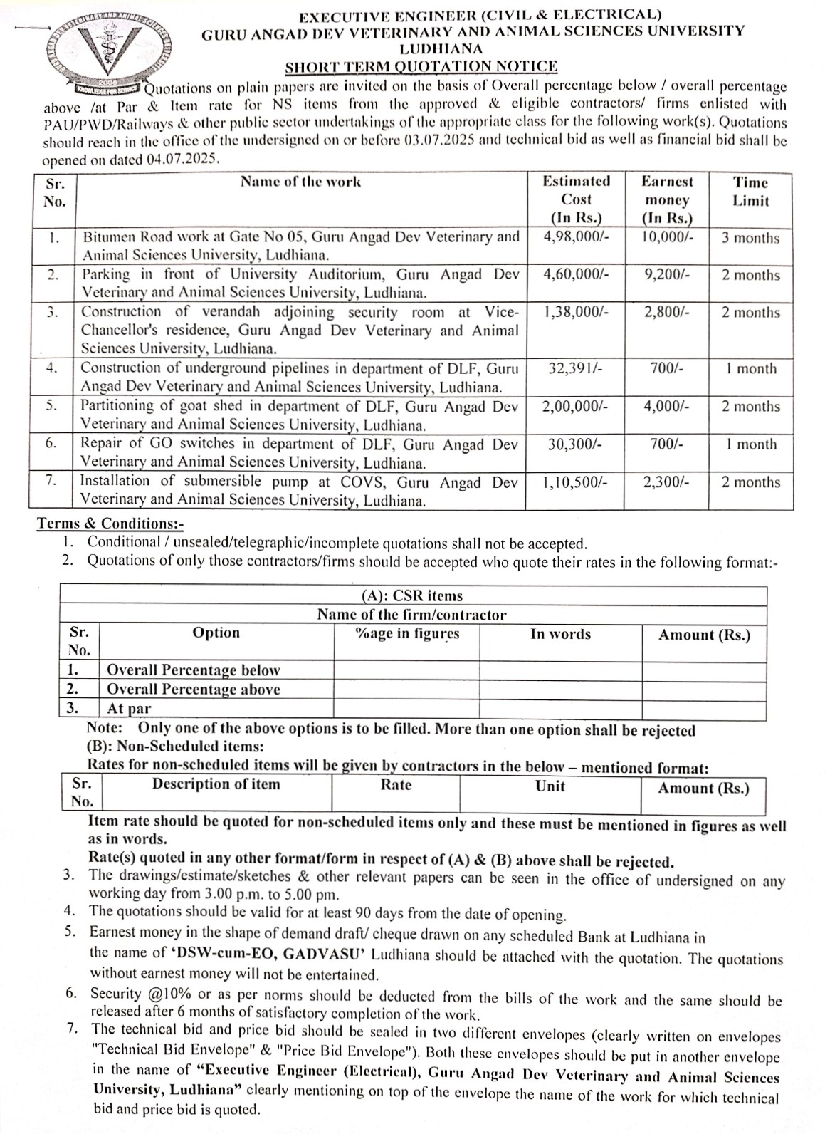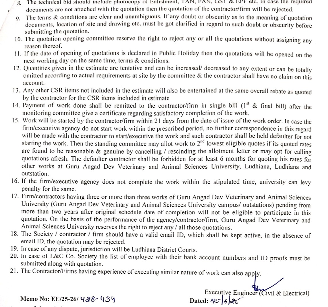 Short term Quotation Notice for various Repair/Renovation works, Executive Engineer (Civil & Electrical), Guru Angad Dev Veterinary & Animal Sciences University, Ludhiana