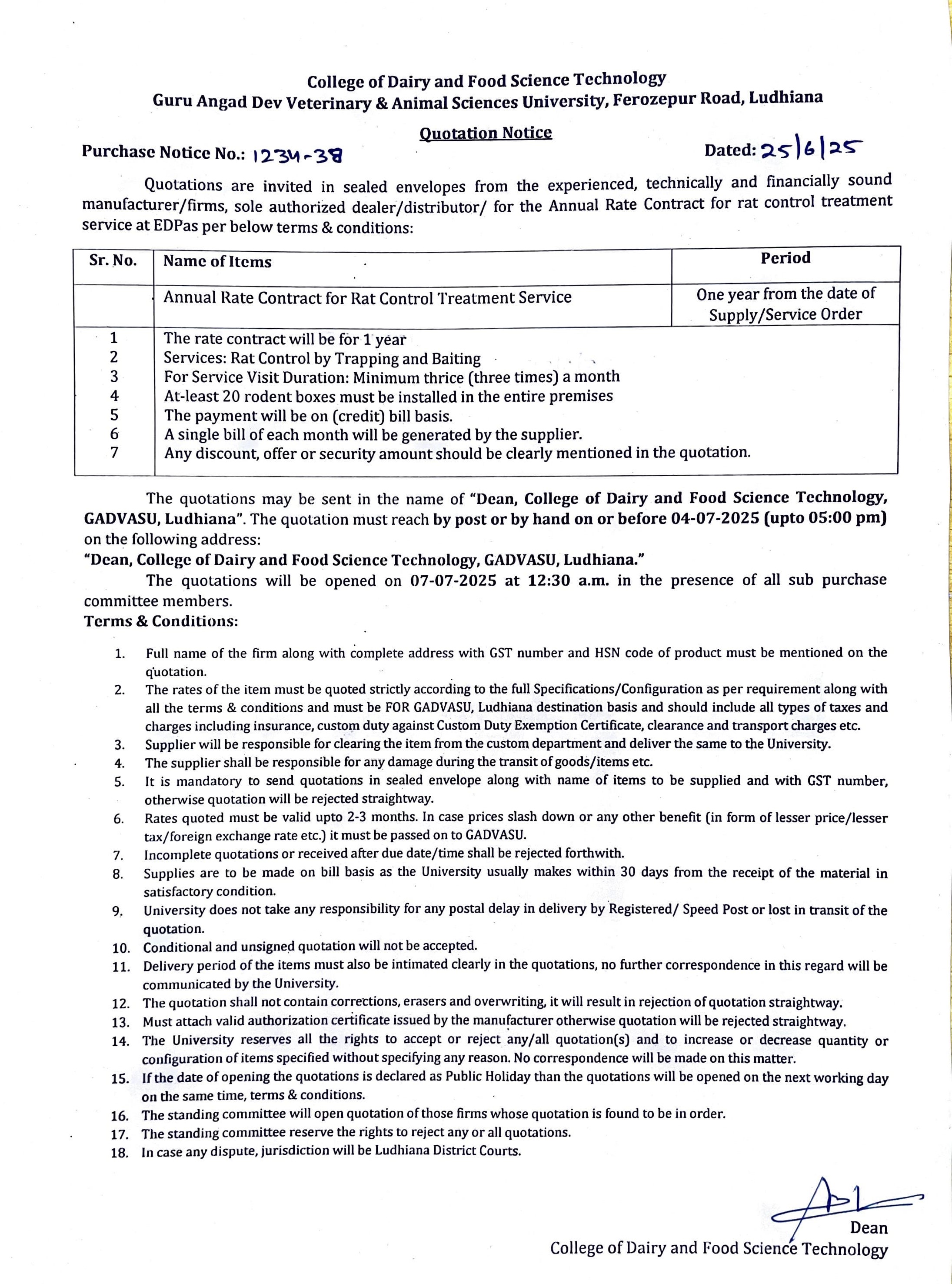 Quotation notice for the Annual rate contract for Rat Control Treatment Service, Dean, College of Dairy and Food Science Technology, Guru Angad Dev Veterinary & Animal Sciences University, Ludhiana