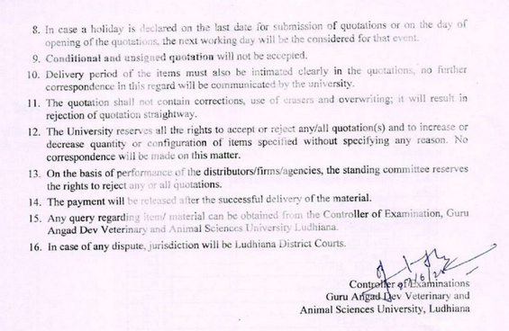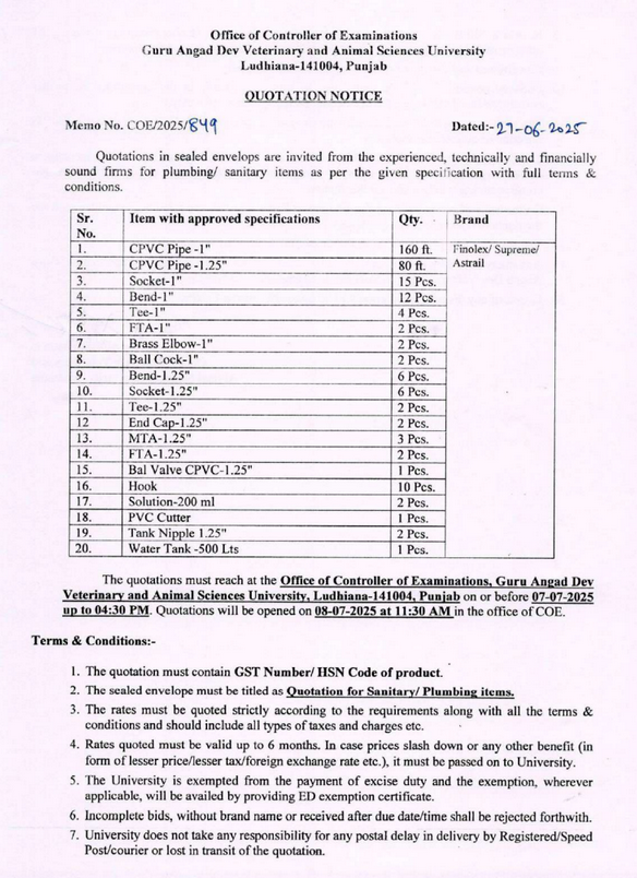 Quotation Notice for Plumbing and Sanitary items, Office of Controller of Examinations, Guru Angad Dev Veterinary & Animal Sciences University, Ludhiana