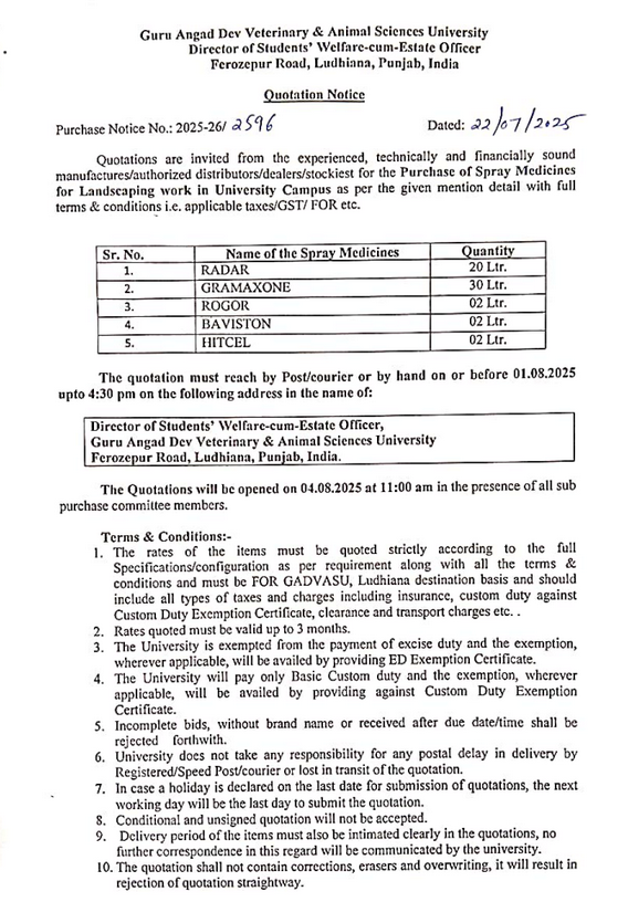 Quotation Notice for the purchase of Spray Medicines, Director of Students Welfare-cum-Estate Officer, Guru Angad Dev Veterinary & Animal Sciences University, Ludhiana