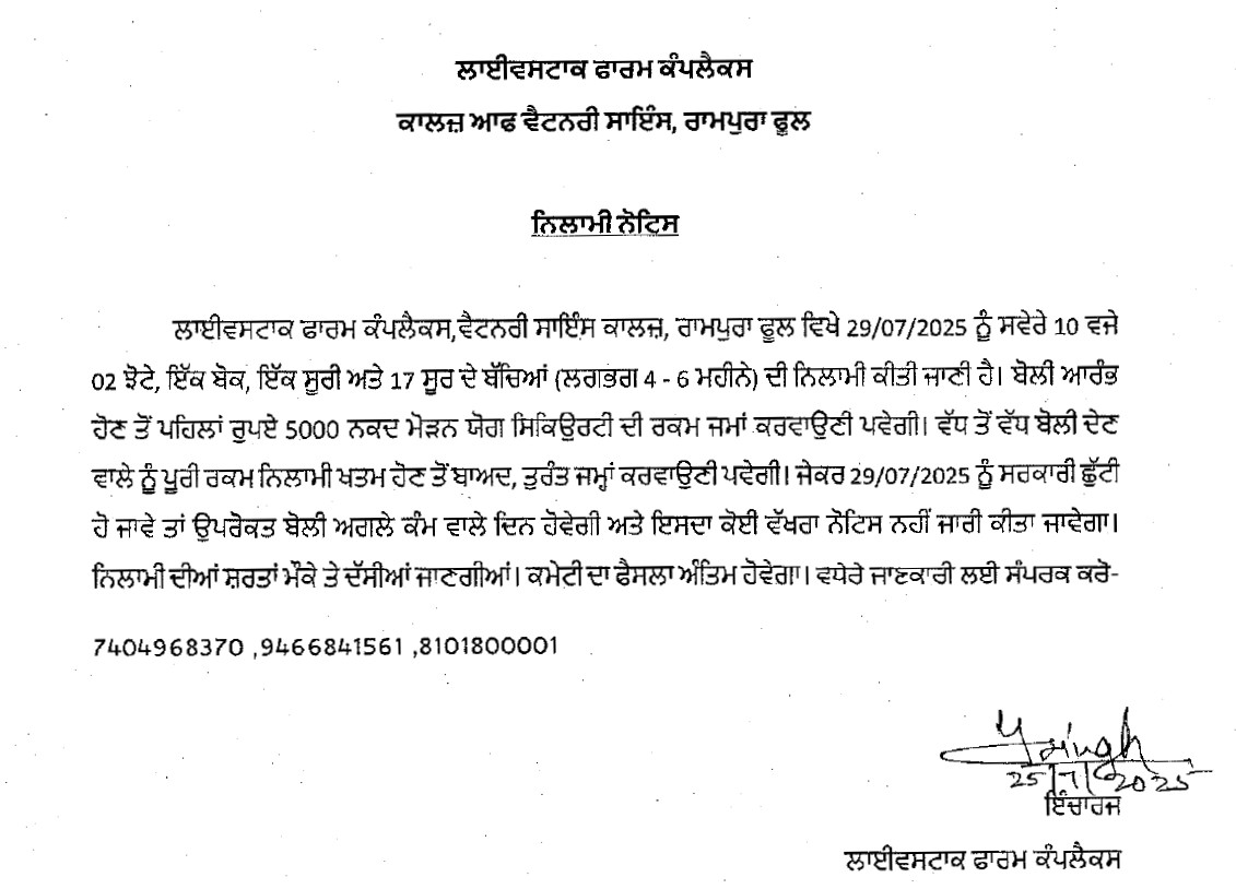 Auction Notice for the Surplus Animals, Incharge, Livestock Farm Complex, Guru Angad Dev Veterinary and Animal Sciences University, Rampura Phul