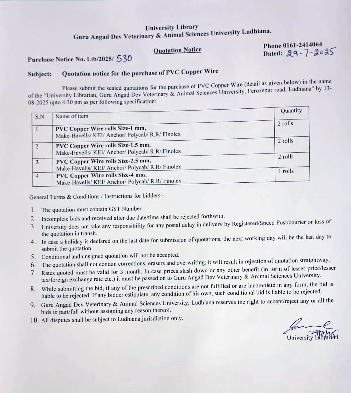 Quotation Notice for the purchase of PVC Copper Wire, University Librarian, Guru Angad Dev Veterinary & Animal Sciences University, Ludhiana