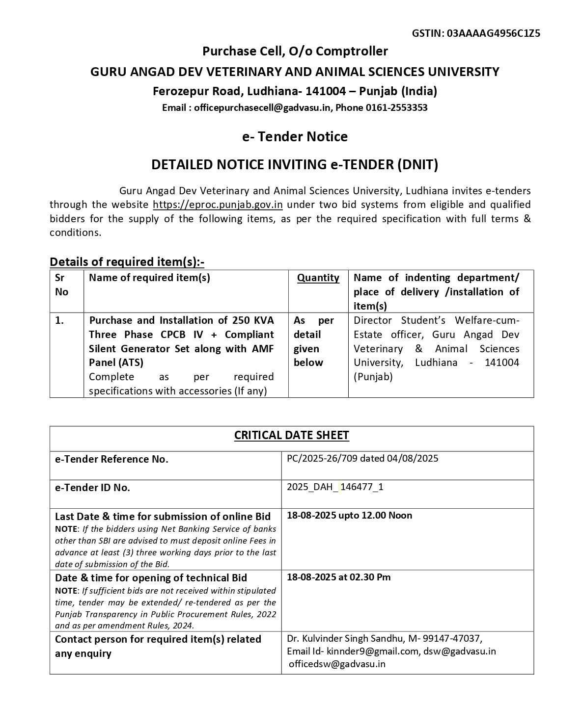 e -Tender notice for Purchase and Installation of 250 KVA Three Phase CPCB IV + Compliant Silent Generator Set along with AMF Panel (ATS), Accounts Officer, Purchase Cell, O/o Comptroller, GADVASU
