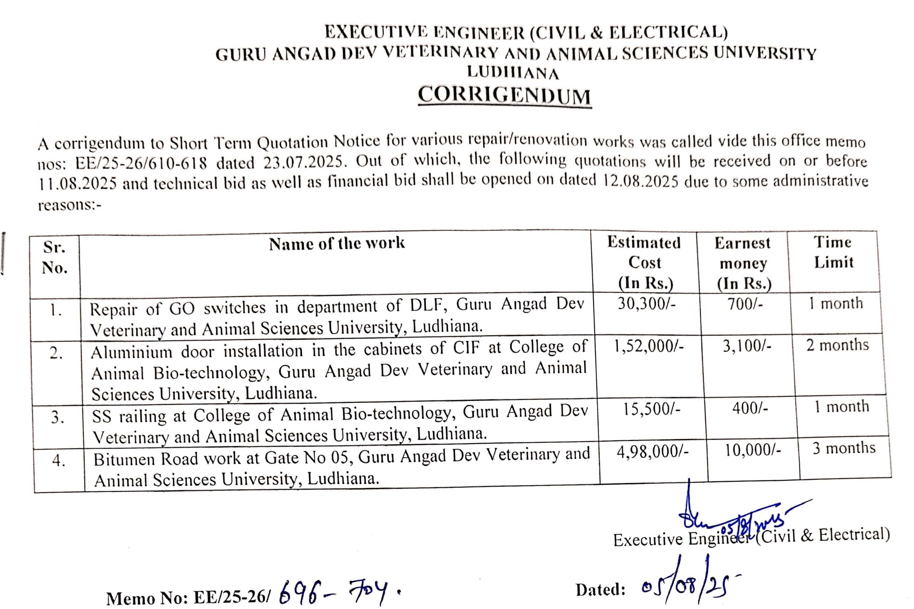 Corrigendum to Short term Quotation Notice for various Repair/renovation works, Executive Engineer (Civil & Electrical), Guru Angad Dev Veterinary & Animal Sciences University, Ludhiana