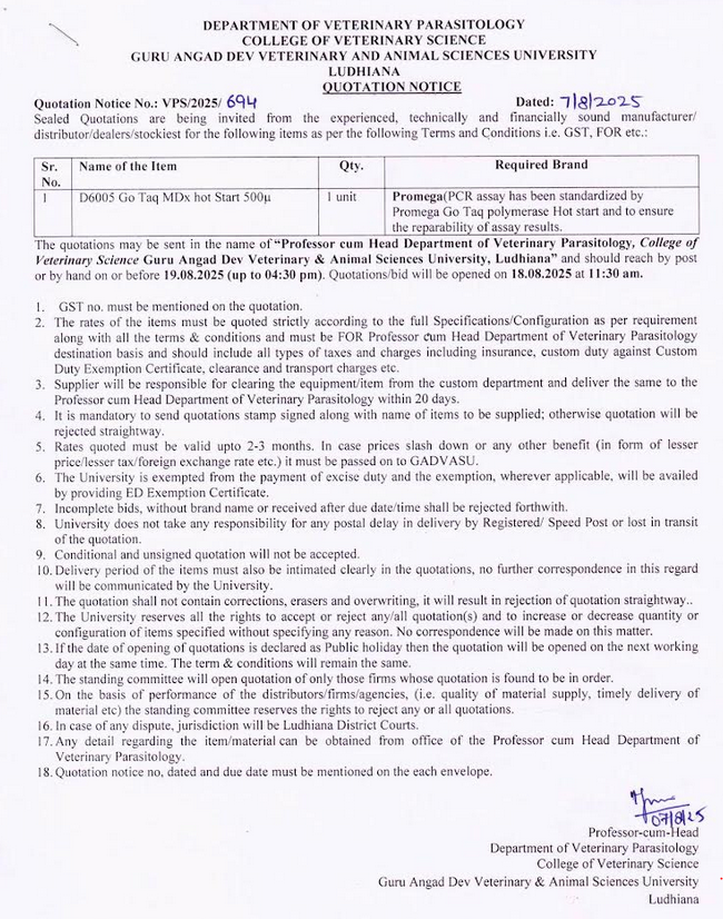 Quotation Notice for D6005 Go Taq MDx hot Start 500u, Department of Veterinary Parasitology, COVS, Guru Angad Dev Veterinary & Animal Sciences University, Ludhiana