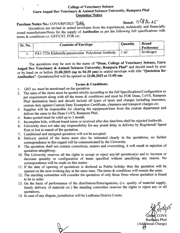 Quotation notice for the supply of Antibodies, Dean, College of Veterinary Science, Guru Angad Dev Veterinary & Animal Sciences University, Rampura Phul