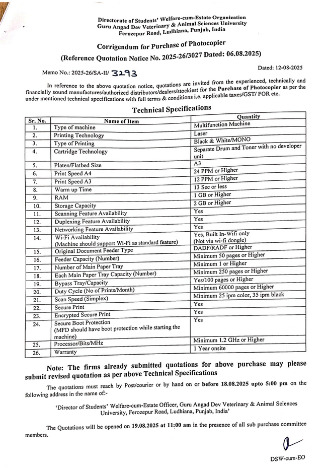 Corrigendum for purchase of Photocopier (Reference Quotation Notice No. 2025.26-3027 Dated 06.08.2025, Director of Students Welfare-cum-Estate Officer, GADVASU, Ludhiana