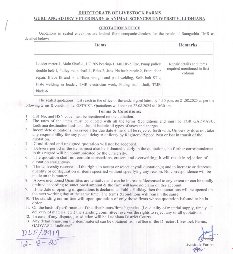 Quotation Notice for the repair of Ramgarhia TMR, Director, Livestock Farms, Guru Angad Dev Veterinary & Animal Sciences University, Ludhiana