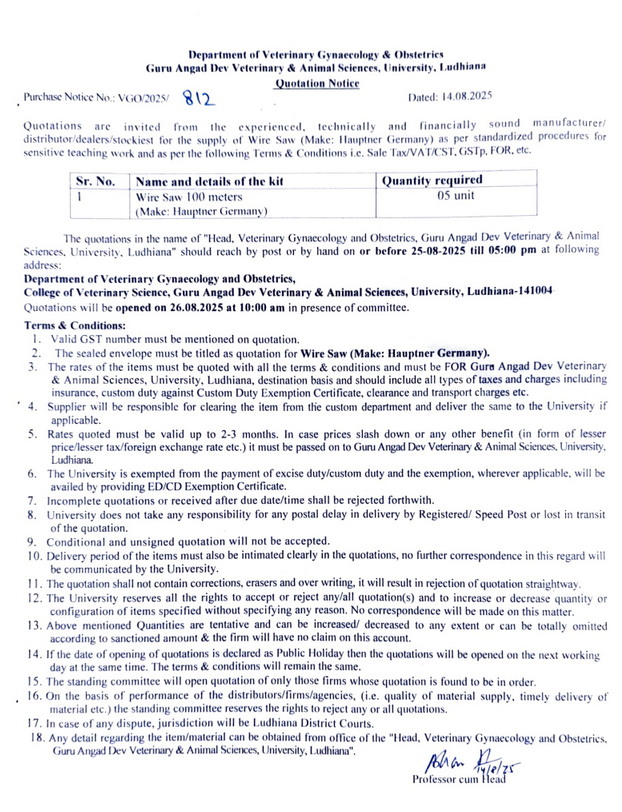 Quotation Notice for the supply of Wire Saw (Make: Haupter Germany), Department of Veterinary Gynaecology and Obstetrics, COVS, GADVASU, Ludhiana