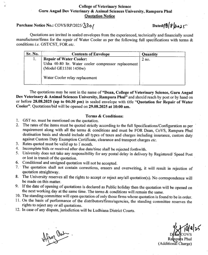 Quotation Notice for the Repair of Water Cooler, Dean, College of Veterinary Science, Guru Angad Dev Veterinary & Animal Sciences University, Rampura Phul