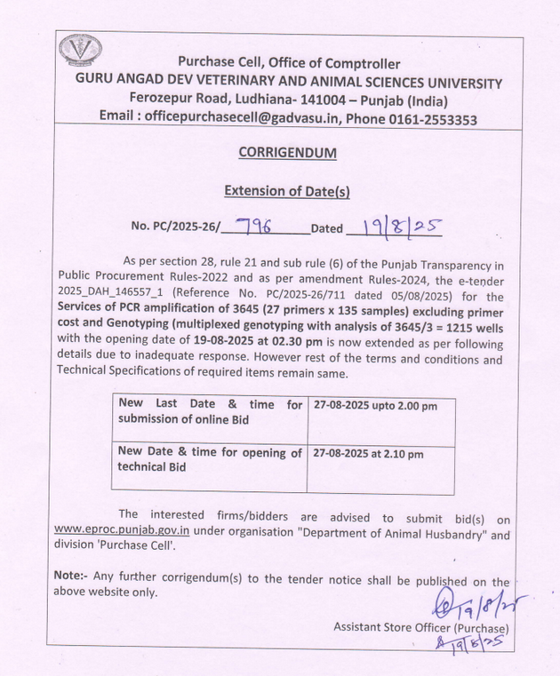 Corrigendum for Extension of dates of e tender for the Services of PCR amplification of 3645 (27 primers x 135 samples) ,Assistant Accounts Officers, Purchase Cell, GADVASU, Ludhiana