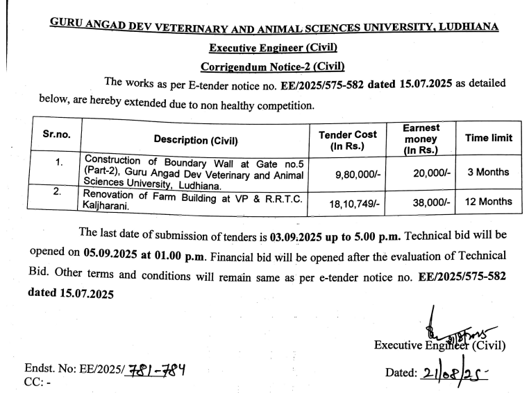 Corrigendum-2 in r/o E-Tender Notice no.575-582 dated 15.07.2025 (Civil Works), Executive Engineer (Civil), Guru Angad Dev Veterinary and Animal Sciences University, Ludhiana