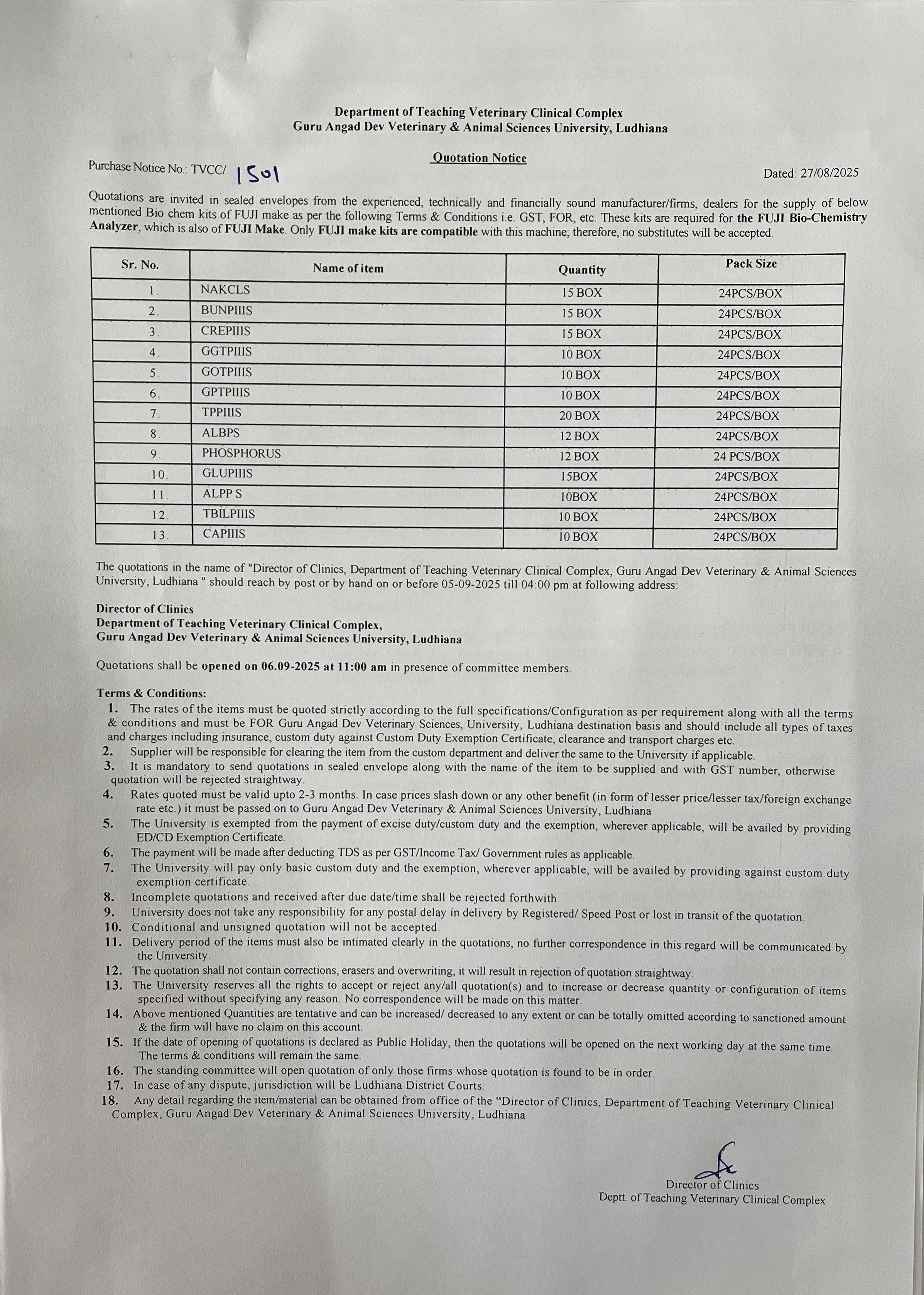 Quotation notice for supply of Bio chem kits of Fuji make, Director of Clinics, Department of Teaching Veterinary Clinical Complex, Guru Angad Dev Vety. & Ani. Sci. Univ., Ldh