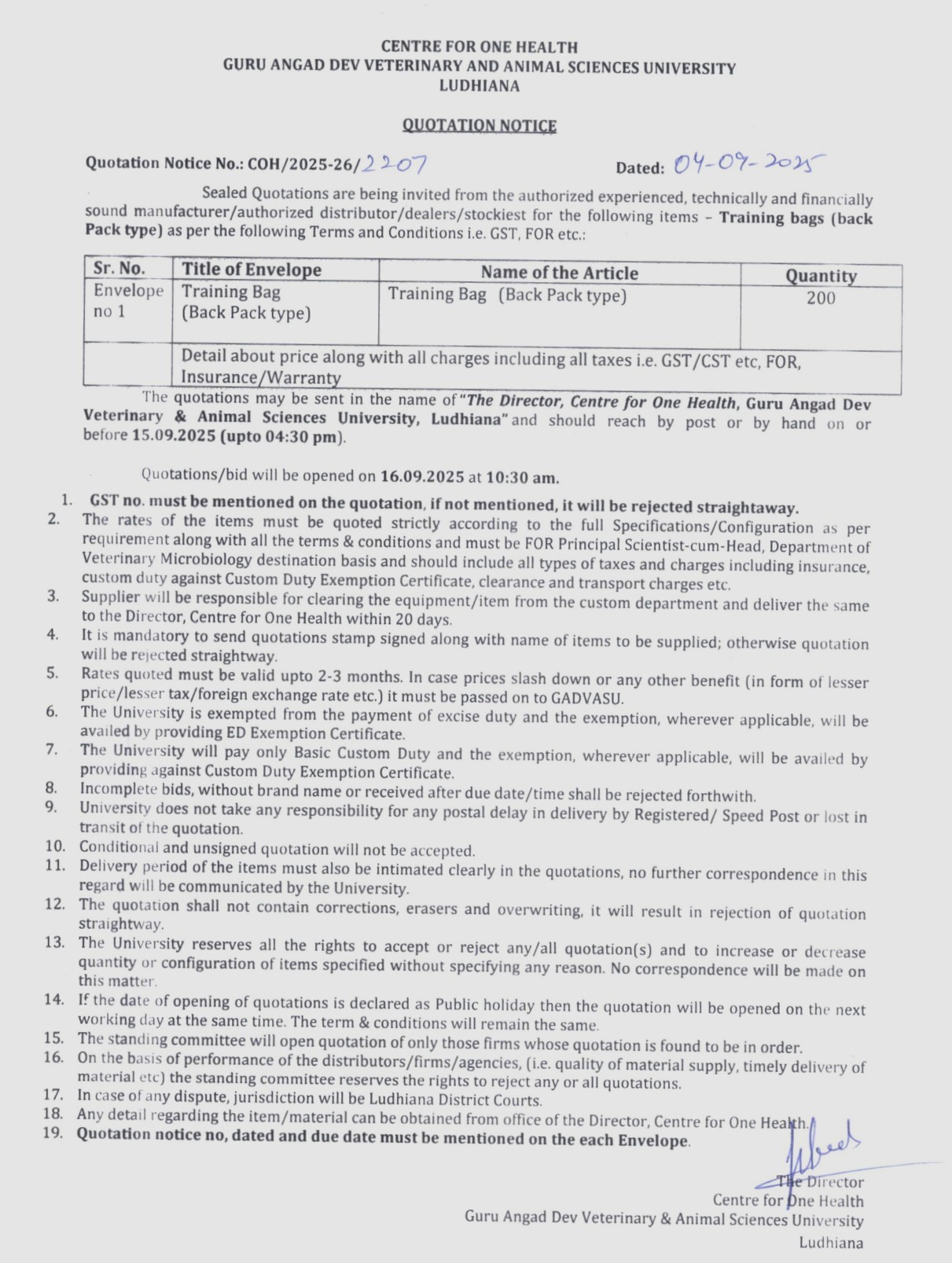 Quotation Notice for the purchase of Training Bags (Back Pack type), Director, Centre for One Health, Guru Angad Dev Veterinary & Animal Sciences University, Ludhiana