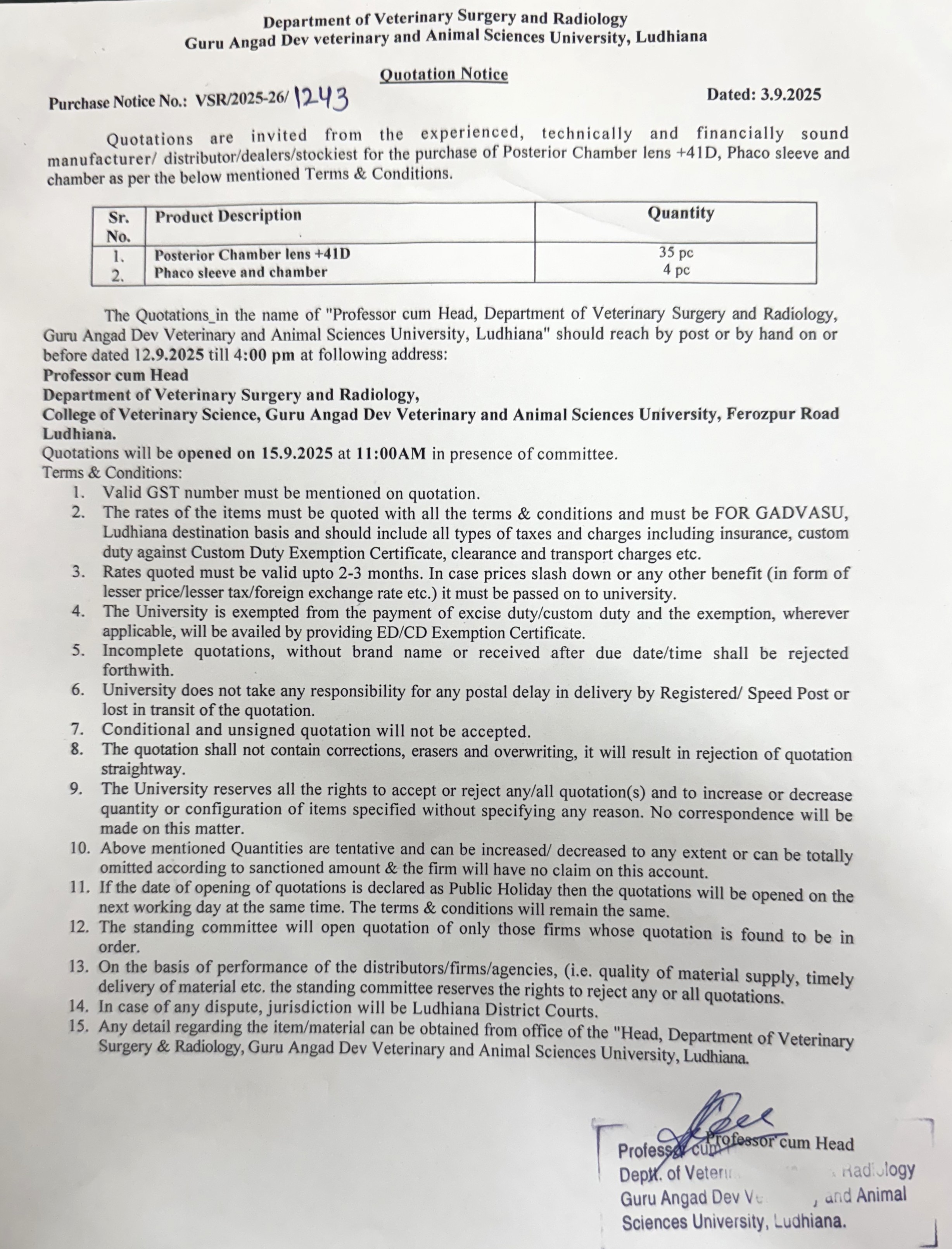 Quotation notice for the purchase of Posterior Chamber lens +41D, Phaco sleeve and chamber, Department of Veterinary Surgery and Radiology, Guru Angad Dev Vety & Ani. Sci. Univ. Ldh