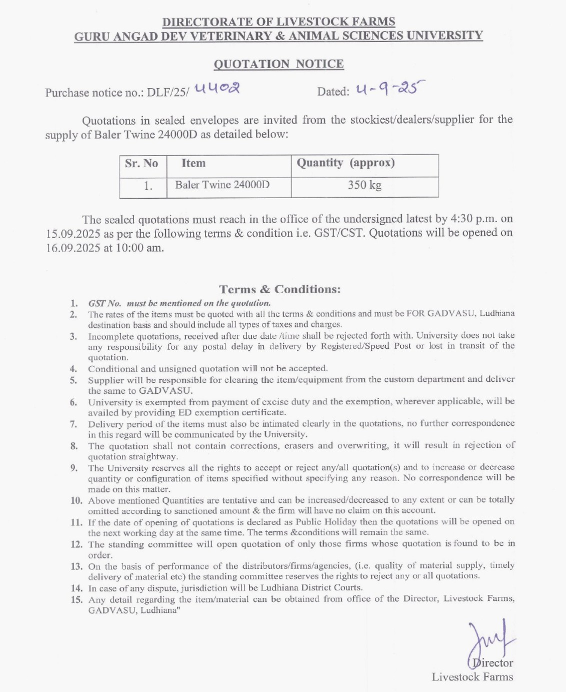 Quotation Notice for the supply of Baler Twine 24000D, Director, Livestock Farms, Guru Angad Dev Veterinary & Animal Sciences University, Ludhiana