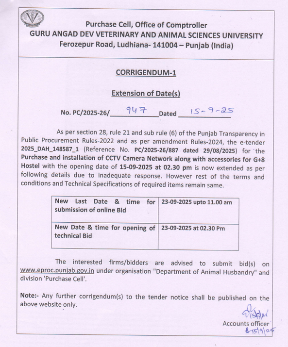 Corrigendum for Extension of dates of e tender for the purchase and installation of CCTV Camera Network along with accessories for G+8 Hostel, Purchase Cell, O/o Comptroller, GADVASU, Ldh