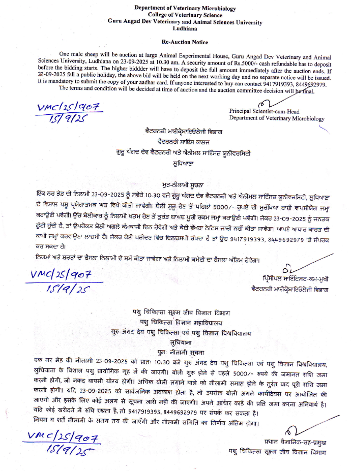 Re-Auction Notice(One Male Sheep), Department of Veterinary Microbiology, COVS, Guru Angad Dev Veterinary & Animal Sciences University, Ludhiana