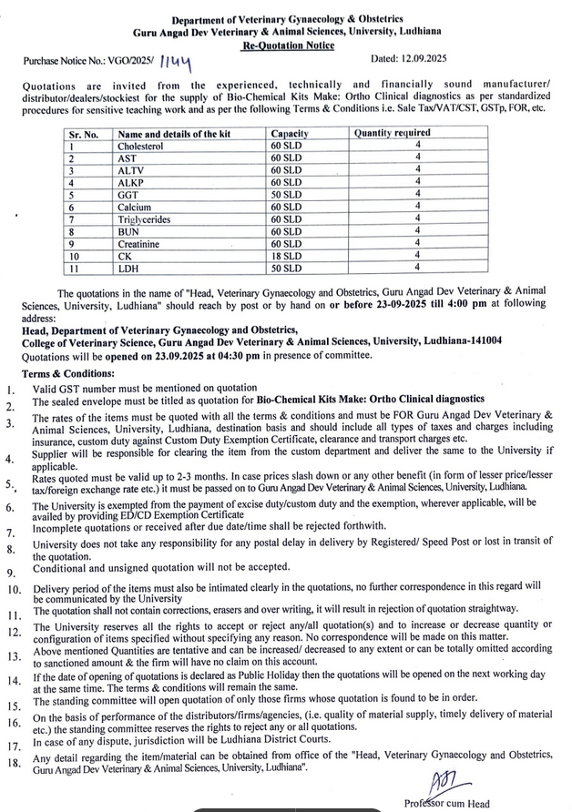 Revised Quotation Notice for Bio Chemical Kits, Department of Veterinary Gynaecology and Obstetrics, COVS, Guru Angad Dev Veterinary & Animal Sciences University, Ludhiana