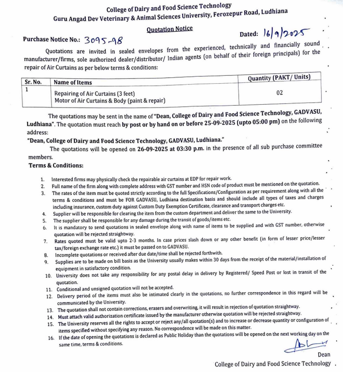 Quotation notice for the repair of air curtains, Dean, College of Dairy and Food Science Technology, Guru Angad Dev Veterinary & Animal Sciences University, Ludhiana