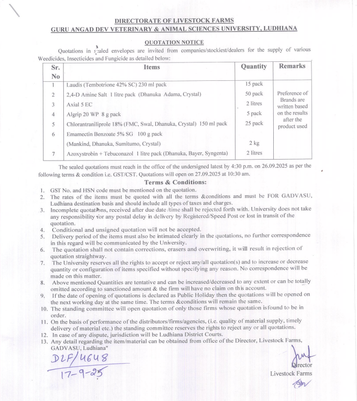 Quotation notice for weedicide, insecticide and Fungicide, Directorate of Livestock Farms, Guru Angad Dev Veterinary & Animal Sciences University, Ludhiana