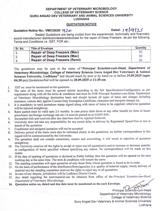 Quotation Notice for repair of deep freezers, Department of Veterinary Microbiology, COVS, Guru Angad Dev Veterinary & Animal Sciences University, Ludhiana