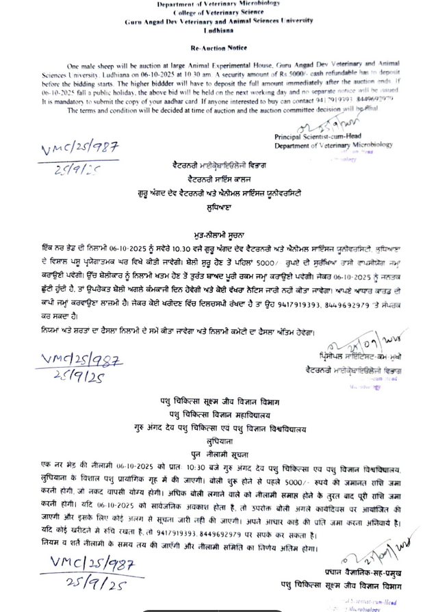 Auction Notice(One Male Sheep), Department of Veterinary Microbiology, COVS, Guru Angad Dev Veterinary & Animal Sciences University, Ludhiana