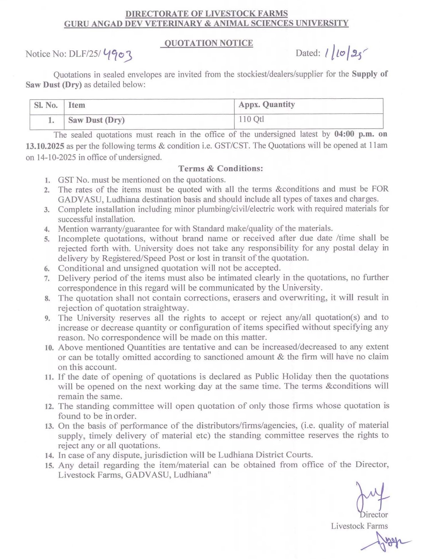 Quotation notice for the supply of Saw Dust (Dry), Director, Directorate of Livestock Farms, Guru Angad Dev Veterinary & Animal Sciences University, Ludhiana
