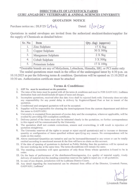 Quotation notice for the supply of Chemicals, Directorate of Livestock Farms, Guru Angad Dev Veterinary & Animal Sciences University, Ludhiana